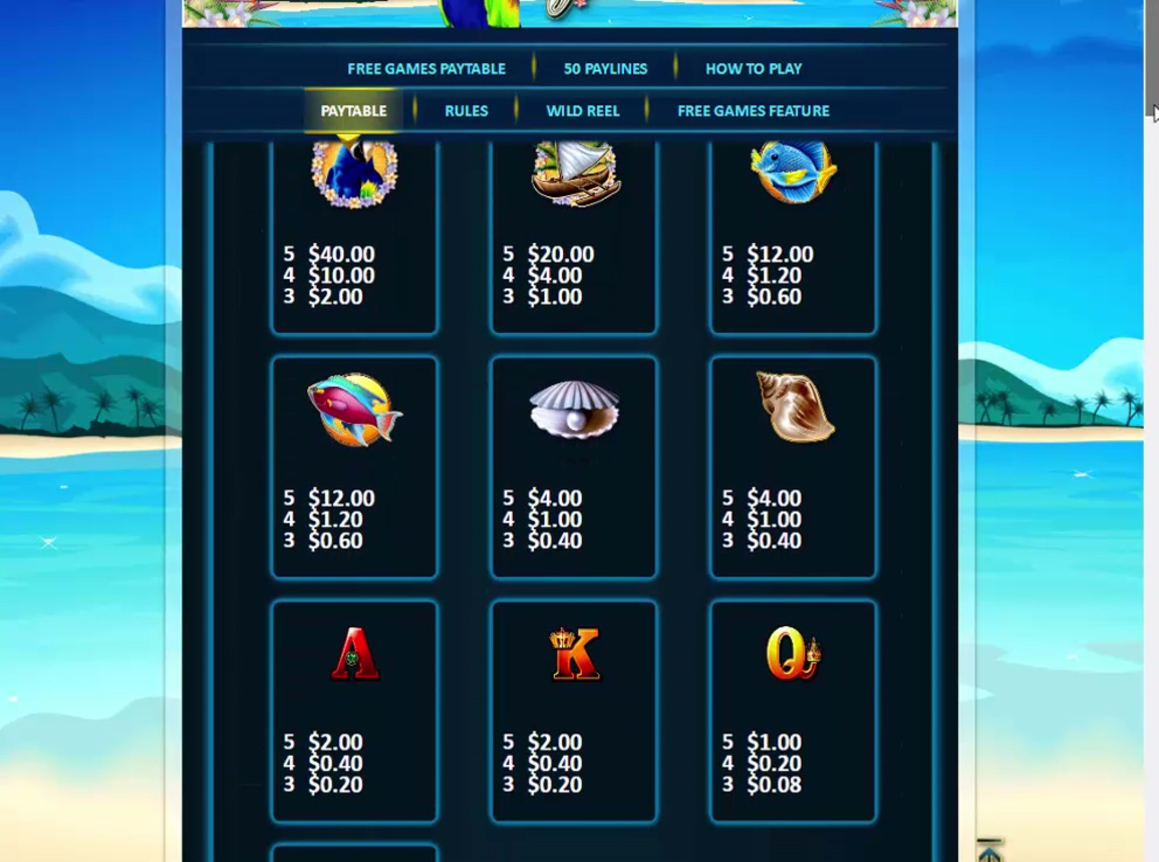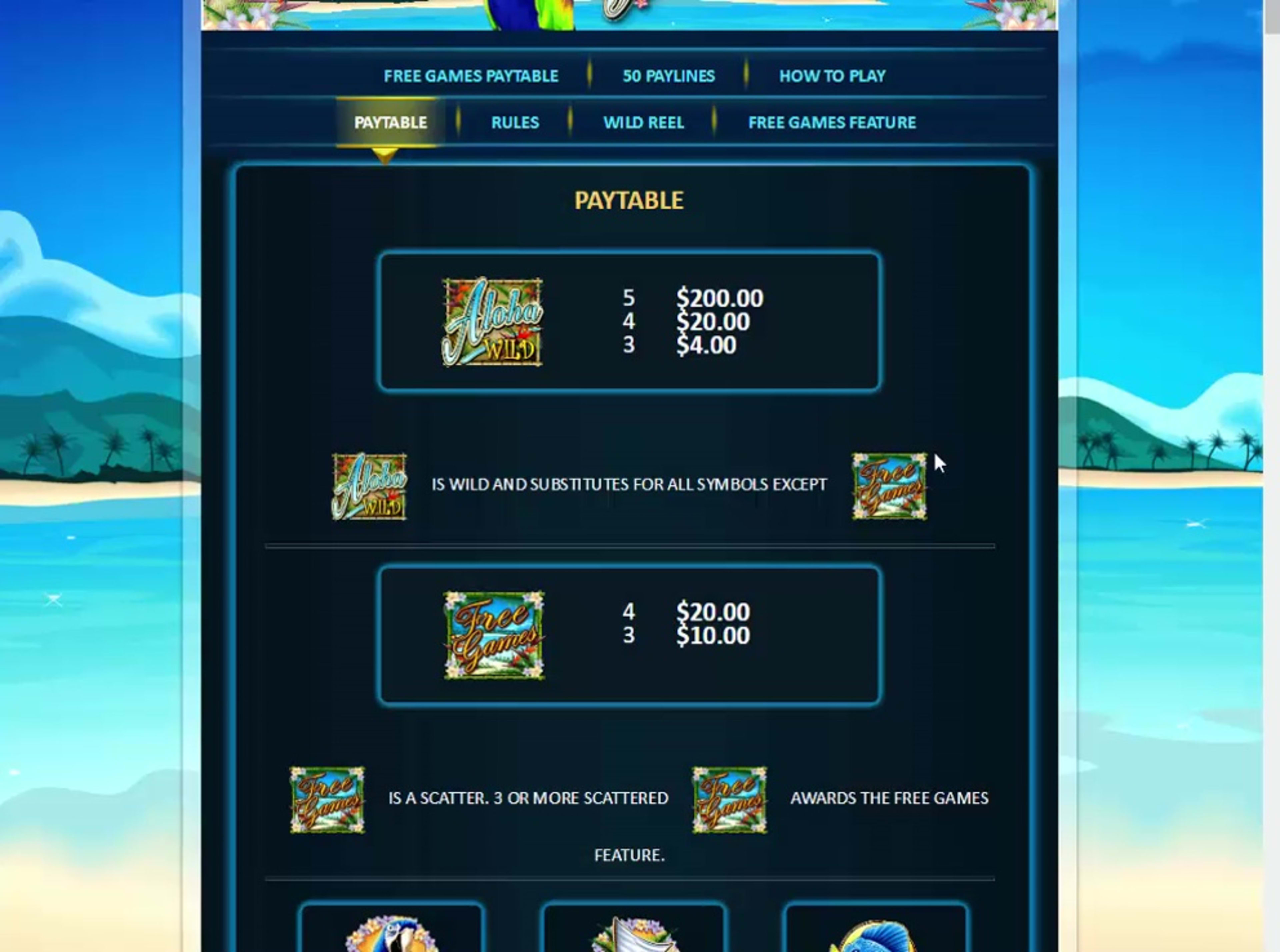 Look towards the wild symbol if you want to land the biggest prize that Aloha Island can deliver. You can win $50,000 at most with it, which is a 5,000x return on your line bet. If you can’t get enough wilds to form combinations with them, you can still have them in their usual role of substitutes. Just land wild symbols exactly where they’re needed, and they will help you get paid. You still can’t use them to replace scatter symbols though, which is what happens in almost all slots that have them. The game will place a wild reel, at random, during each spin. You get three stacked wilds on that reel, and they can be quite helpful. The scatter’s image is that of the beach, with the Free Games logo in front. It’s a symbol that you can pretty much use no matter where it lands, and it can do two things for you. One of those things is that it can give you a prize, whenever you have three or four symbols visible on the reels. The other is that it’s a trigger for the free spins. You only get 5 free spins. The reels are different from those available during paid spins. Each new scatter symbol that you land will add an additional free game. The payouts seem to be triple those from the base game, according to the paytable.