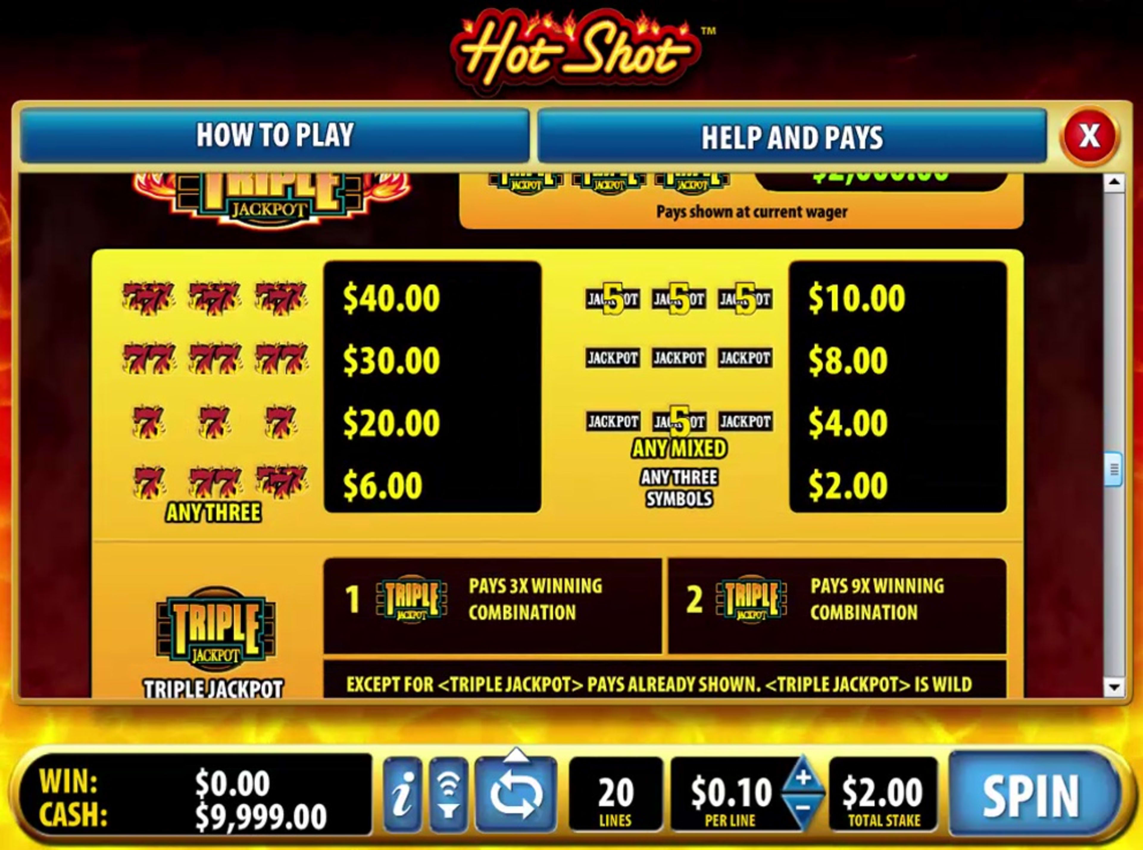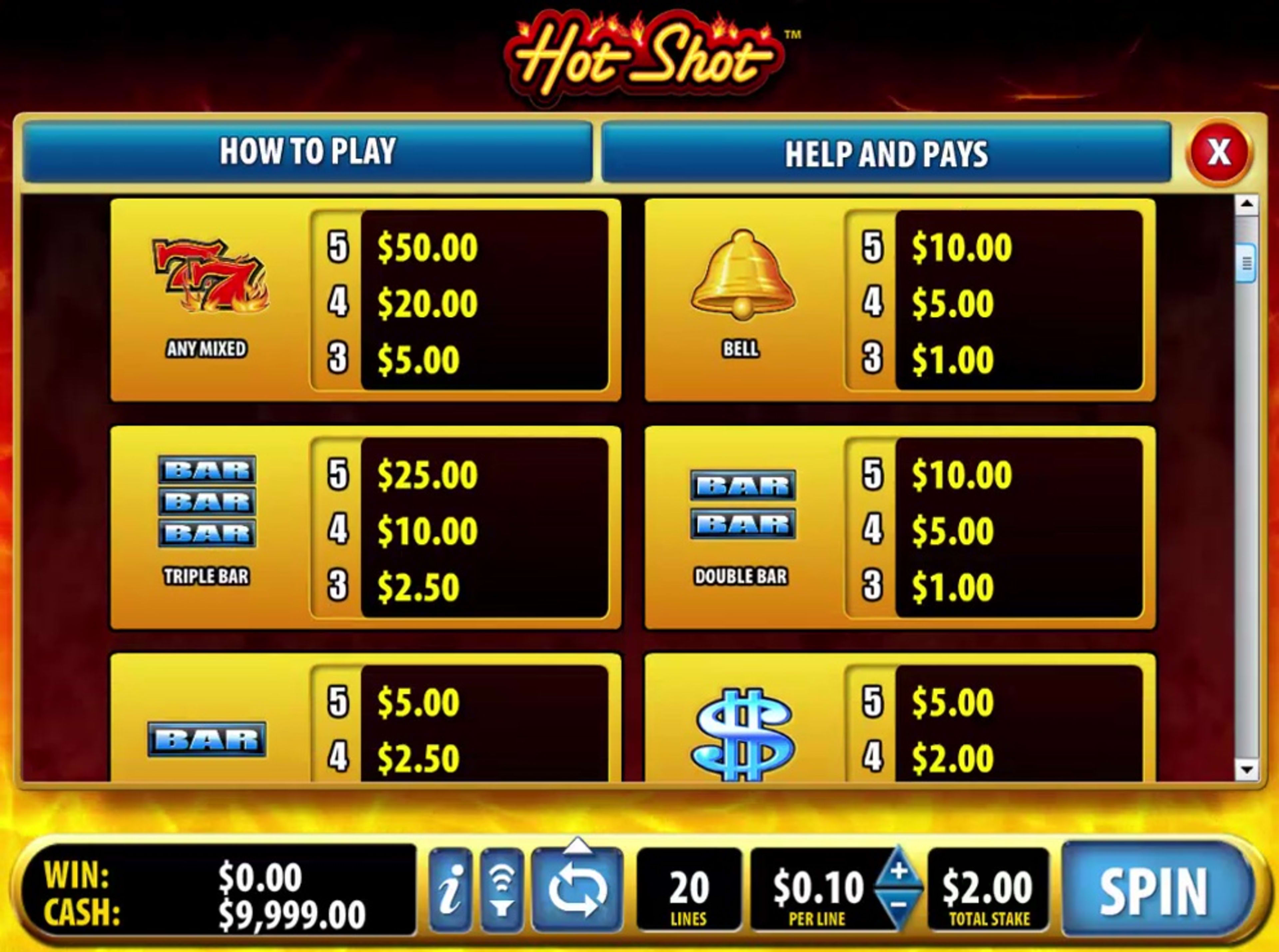 Hot Shot was created by Bally Technologies and it is one of the simpler slot machines that they have to offer, at least theme wise. The game is based on the classics, symbol wise at least, but with a more modern layout and features in place. In Hot Shot, the 5 reels of the slot have 20 fixed lines available. There are multiple jackpots to be won, one of them even reaching a top value of $4,000,000. You will also have a bonus feature inside, plus wild symbols, scatters and multipliers that can get as high as 49x.