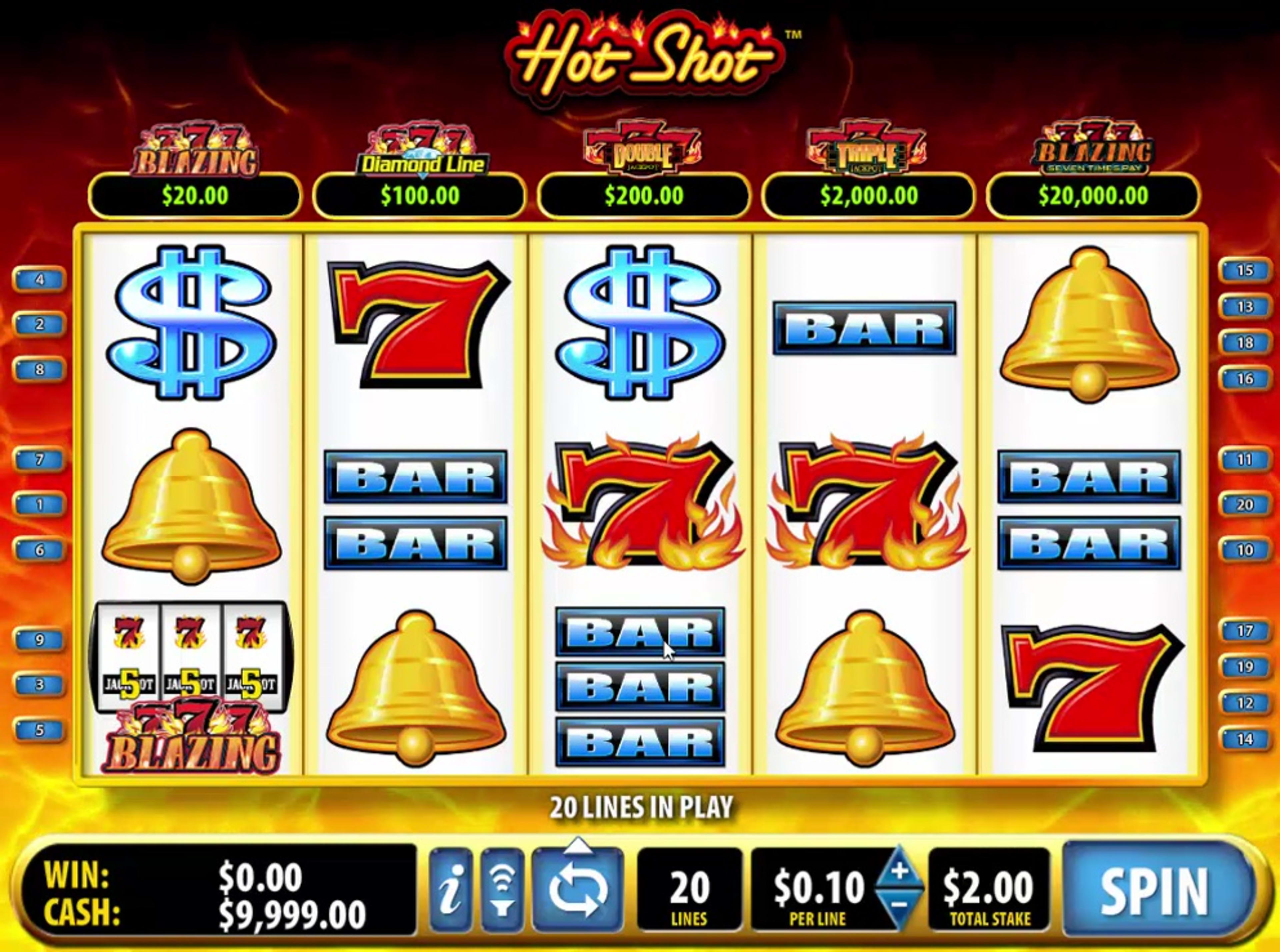 Hot Shot was created by Bally Technologies and it is one of the simpler slot machines that they have to offer, at least theme wise. The game is based on the classics, symbol wise at least, but with a more modern layout and features in place. In Hot Shot, the 5 reels of the slot have 20 fixed lines available. There are multiple jackpots to be won, one of them even reaching a top value of $4,000,000. You will also have a bonus feature inside, plus wild symbols, scatters and multipliers that can get as high as 49x.