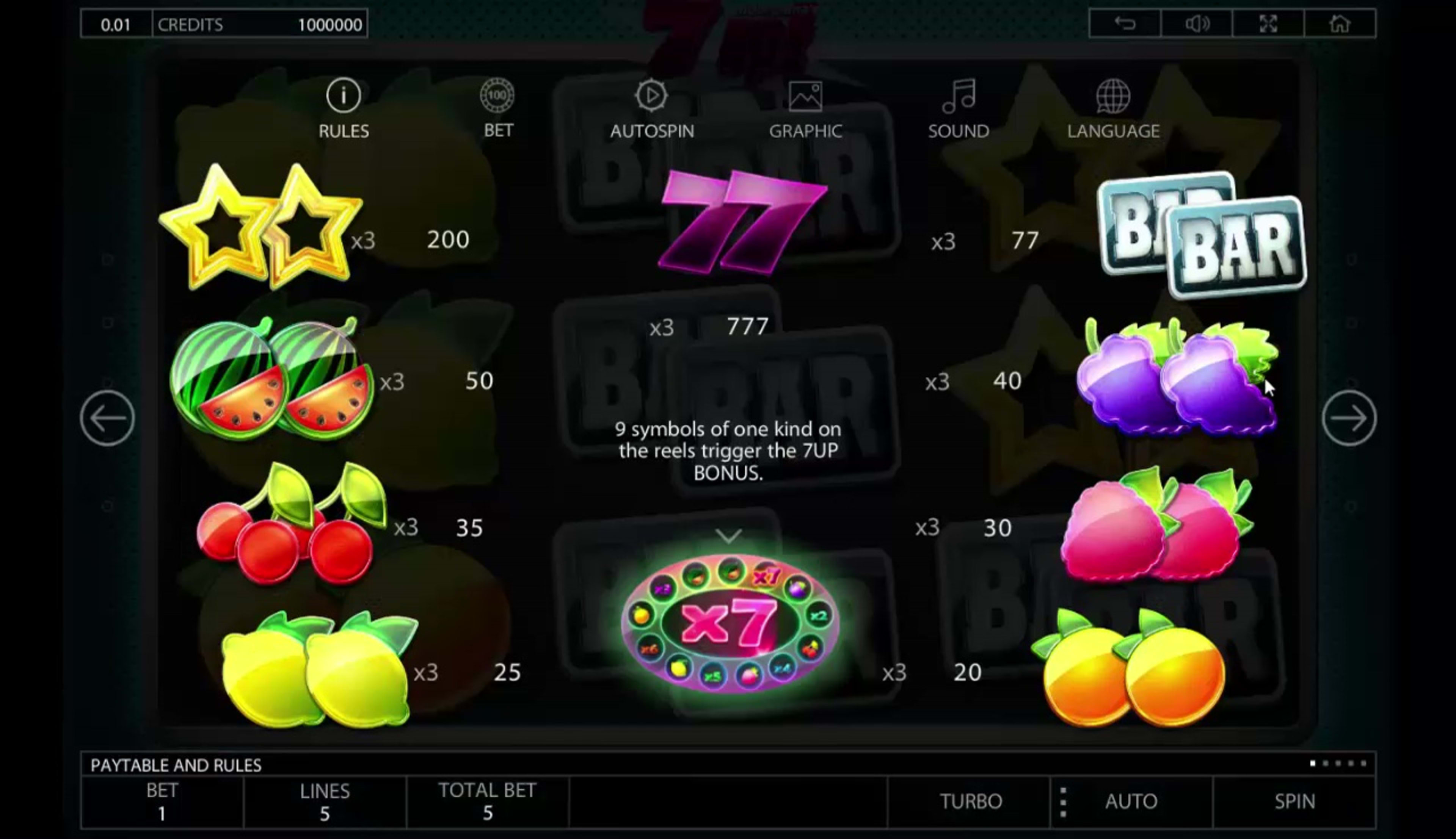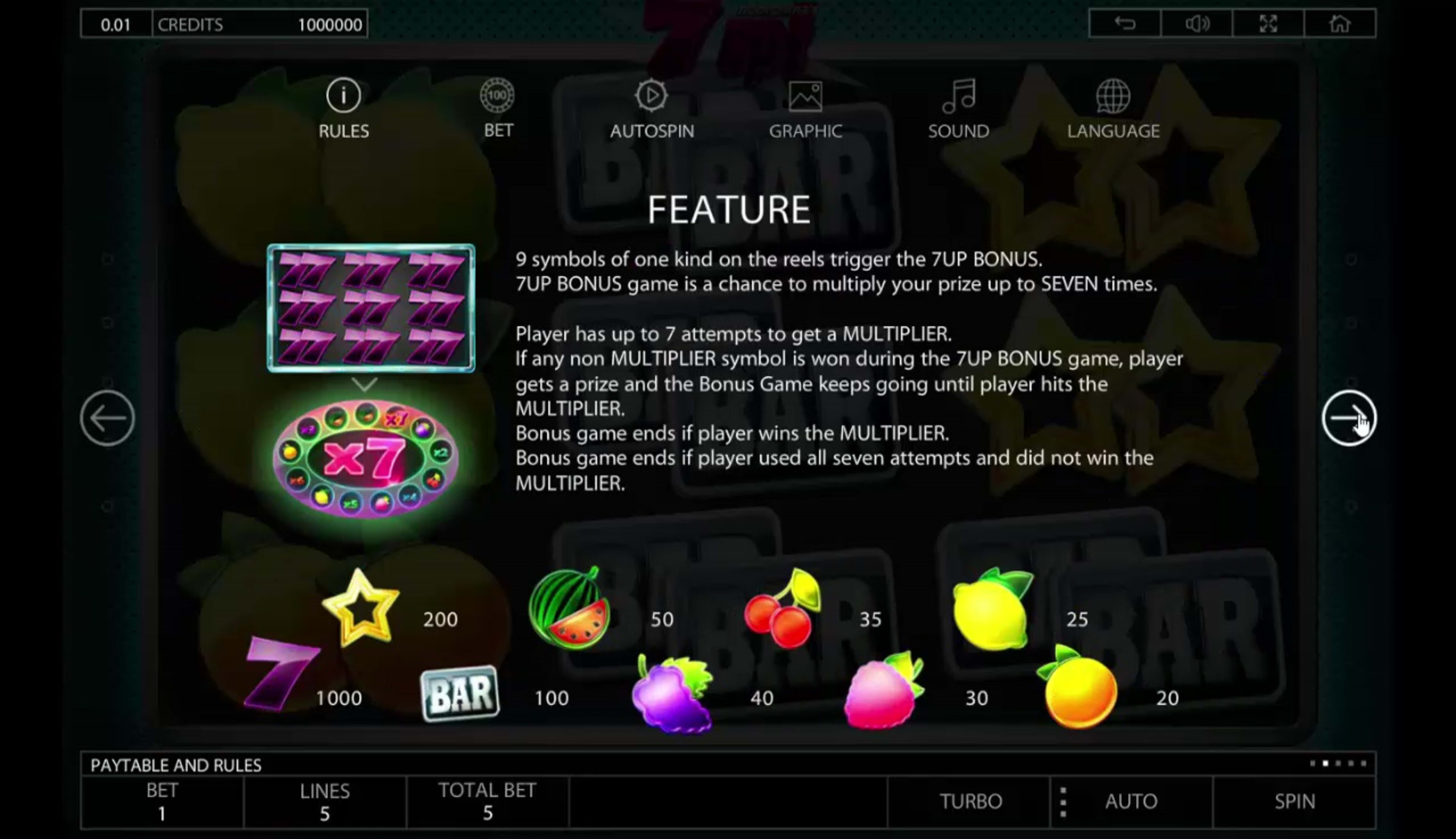 The wagers of 7up! appear to be slightly more advanced than those from most classics. In addition to the selection of up to 5 active lines, you will also be able to use up to 10 coins for every single one of them. The credit value is the final one that you have control over, and you can change it by clicking on the upper left corner value, the one next to the Credits display. The maximum bet that you can have covering a spin is going to be worth $50, each line getting up to $10.