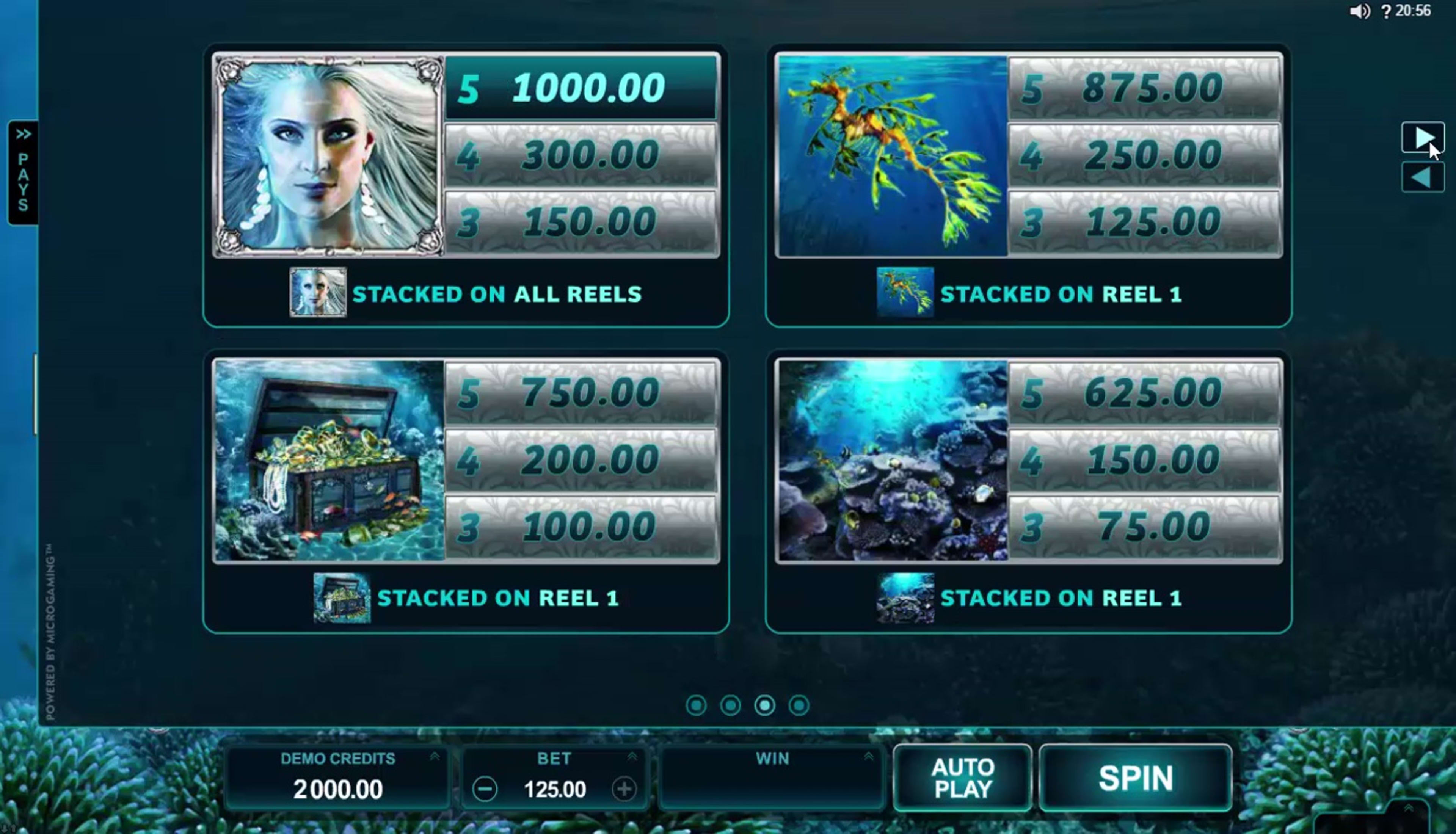Ariana’s theme revolves around a mermaid that has this particular name, and it’s one of the most important symbols that we see on the reels. The background puts the action at the bottom of the ocean, showing us the life that exists there, from the small banks of fish to the weird plants that you’d never encounter on dry land. The reels are surrounded by a beautifully decorated border, which uses silver and pearls. The symbols which were chosen for this game include the image of Ariana, as well as logos, starfish, plants, coral and treasure chests. The unfortunate side of the paytable comes via the poker cards, as ugly as they always are in Microgaming slots which use them. This developer rarely makes the effort to change the design of the cards, to make them match the theme. The design quality is very good when you check out the high paying symbols, and even the feature triggers. The same can be said about the background image, but not about the low paying symbols. Overall, I felt like it was a decent effort from Microgaming, but in their usual note, nothing that can stand side to side with a game from Net Ent for example.