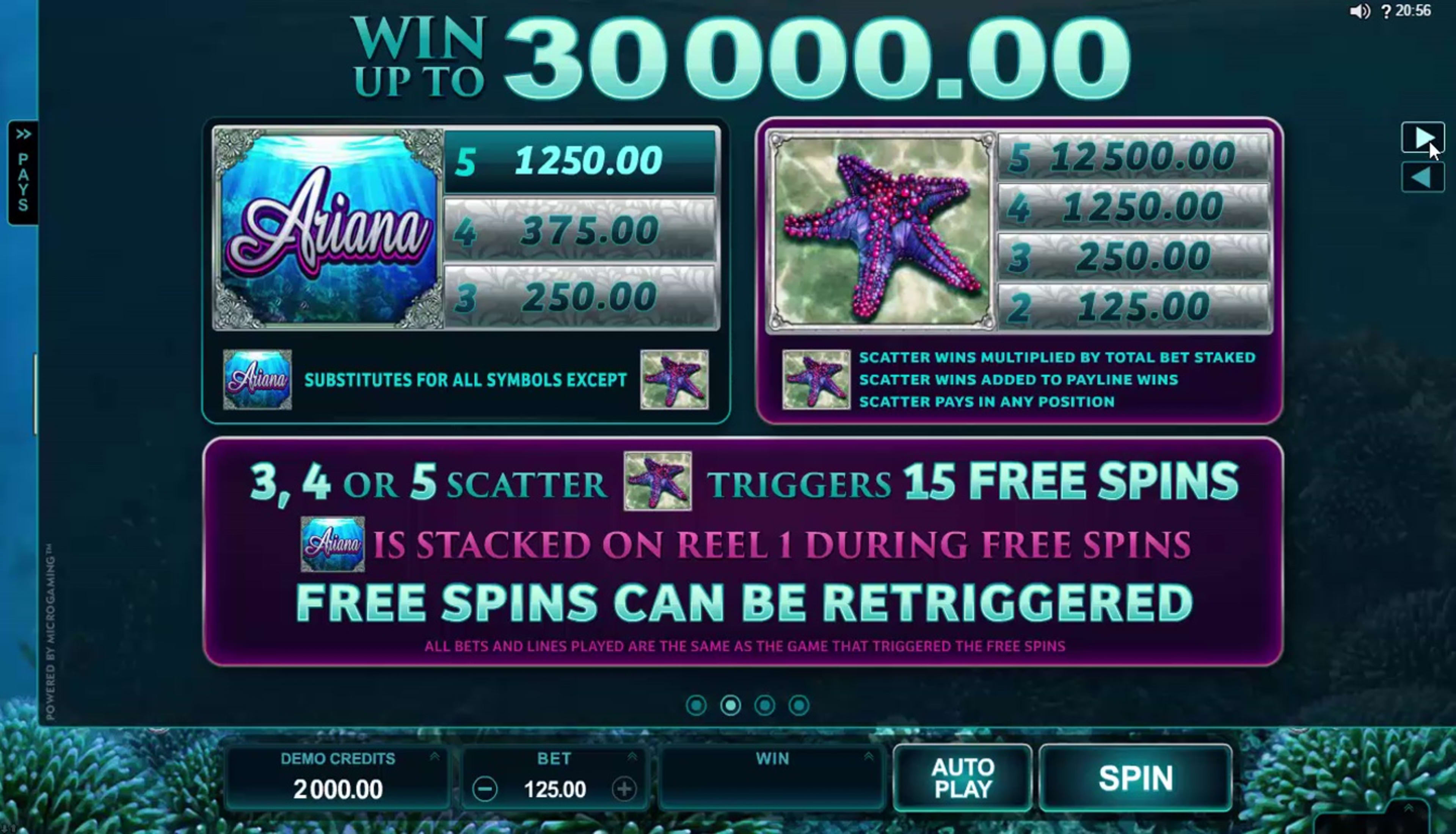 A major feature of Ariana would be the presence of expanding symbols on its reels. For the regular spins, you will notice that any symbol which appears fully stacked on reel 1, will expand regular high paying symbols of the same type on the other reels. They need to be in a winning combo in order to expand though, or they will remain in their usual size. The same feature can be used during the free spins to expand wilds as well, not just high paying symbols. The wild symbols are not going to be missing from the reels of Ariana. They’re present there, and they are useful as replacements for some symbols, or as ways for you to get high paying combinations formed. A combo of five wild symbols can offer the best payout that can be achieved through regular combinations. A wild Logo may not be used to replace a Starfish scatter. Starfish scatter symbols are useful in Ariana in the roles of the scatters, the symbols which you don’t care where they land on the reels, provided that you get at least two or three. With two or more you start getting prizes, while with at least three you trigger free spins. The prizes get up to 100x total bet. The feature with free spins brings you 15 of these rounds for free. During this feature, the Ariana Logo wild appears stacked on the first reel and can be expanded on the other reels, just like the high paying symbols. You can retrigger free spins, with another set of 3+ Starfish.