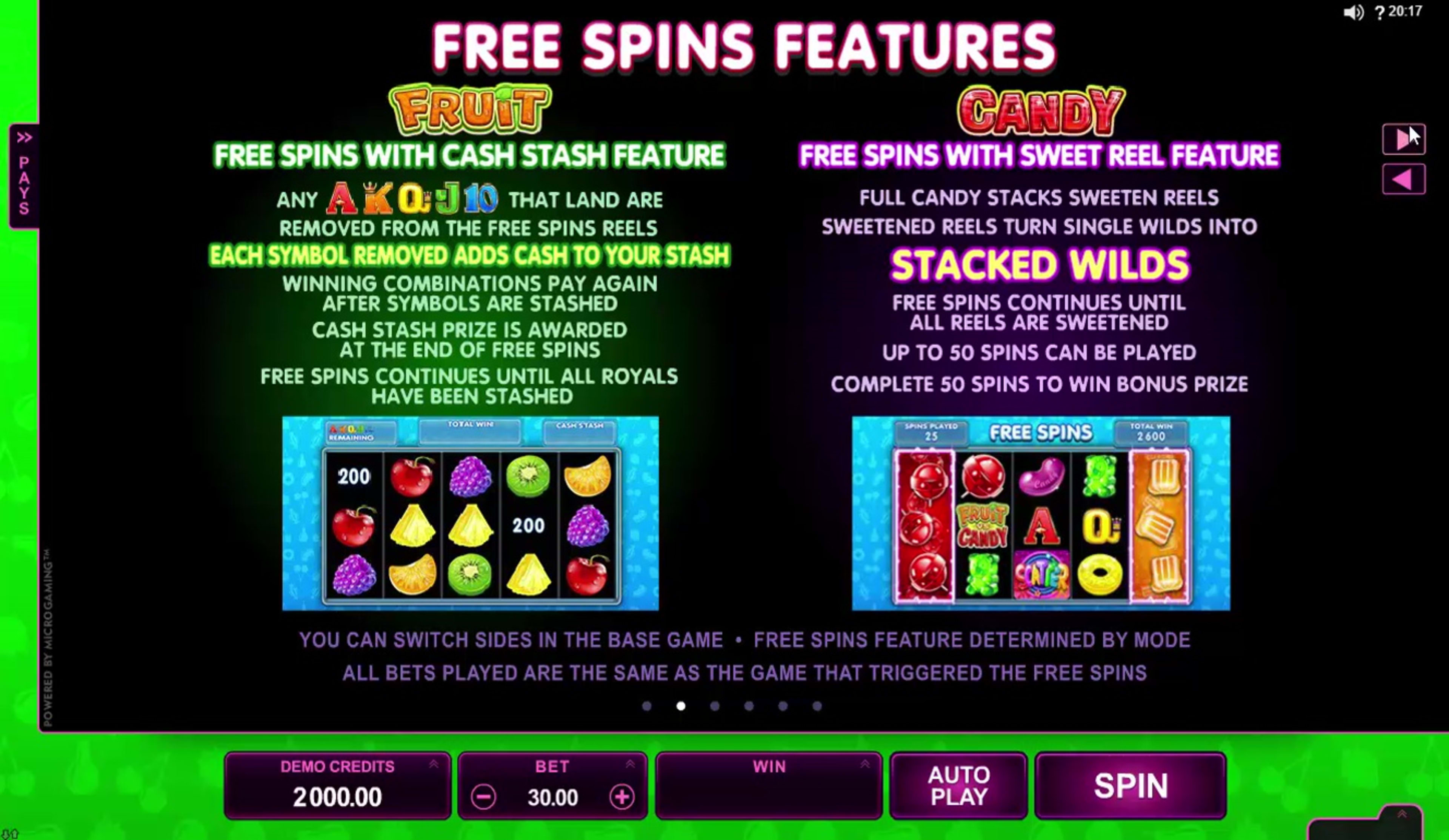 The feature that I’d consider most regular here is the one that has the Fruit vs Candy logo, the wild. You will be able to have it included as a replacement in a regular combination, but it will not be useful with the scatter’s role. You can form a combination out of wilds alone as well, which will pay you up to 300 coins. Feature wise, the difference between the two game modes comes from the free spins, since each one has its own version. Three or more Scatter logos will trigger the free spins, and at the same time they will pay you when there are at least two in position. The Fruit Mode has for you free spins, which have a Cash Stash feature. The Royal symbols, or the poker cards as they’re also called, will be removed when they appear on the reels, and collected in the top left corner. Each removed symbol brings you a cash reward. The winning combinations pay a second time after the Royals are removed from the reels. Once you’ve removed and collected all Royal symbols, the free spins will end. With Candy Mode, the extra feature for the free spins is called Sweet Reel. Stacks of candy symbols appear on the reels, and they will sweeten a reel when a full stack is visible on it. The sweetened reels will transform regular wilds into stacked ones. You keep playing until you have all reels sweetened, or until you’ve gone through 50 rounds. One of the two random features that you can get, in either game mode, is called Sugar Rush Bonus. It will transform all high paying symbols into prizes, but only if you didn’t win any prize that round. You can also trigger free spins with only one Scatter logo present on the reels. The second feature which is random is called Goodie Bag. It triggers at random as well, and it will give you a cash prize.