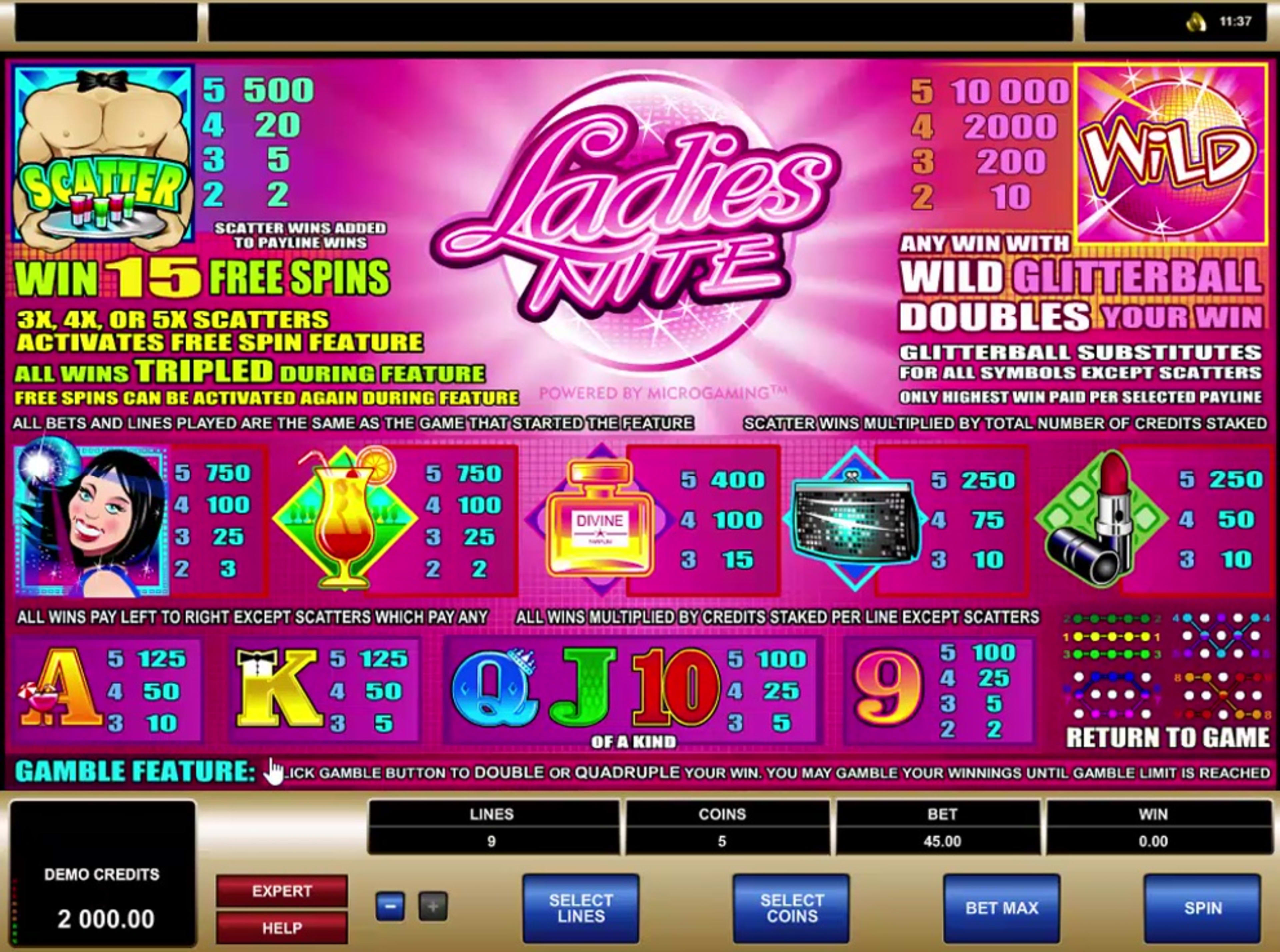Ladies Nite tries to give us an idea of what goes on at ladies only parties, and yes, half naked males seem to be part of the experience, along with a lot of tequila shots, cocktails and dancing. The slot is offered by Microgaming and it’s one of the few that I’ve seen cater to the wild side of the ladies, while men seem to be getting more of these games. Ladies Nite has 5 reels, 3 symbols each, with 9 active lines at most. You have very good payouts to go after, up to $100,000 being offered inside, and there are some excellent features as well, though not very varied ones. You get wilds with their multipliers, scatters, free spins and multipliers for these as well.