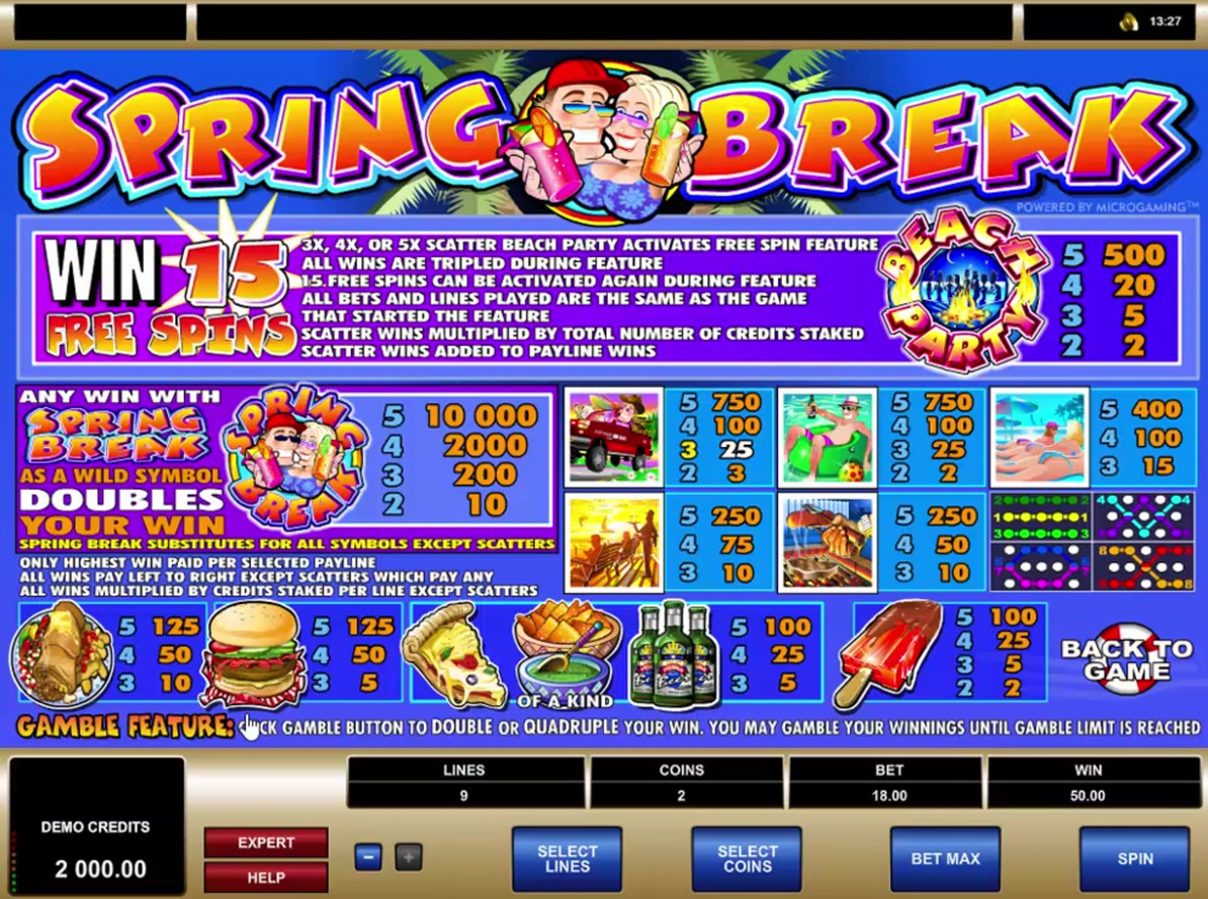 Spring Break is a fond memory for a lot of people that went through college, and so you will find on the reels of this game a lot of elements that will feel familiar if you experienced it yourself. There are boys and girls that are having fun, driving cars, sitting in the sun or drinking, along with a mix of fast foods and alcoholic beverages that are a part of the experience. The list starts with the Beach Party Logo, then with the Spring Break logo, with the jeep drive, with the man sitting in the pool with his beer, with the girls getting a tan, the image of the sunset, the grilled meat, hamburgers, pizza, beer, ice cream and so on. Everything you see inside is inspired by the holiday and by the good times that can be had together with other students, so you’re not getting any boring icons. The theme might be appropriately covered by the symbols which are shown, but the quality isn’t high enough to make this a great slot. It might be just the fact that it is an older game from Microgaming, but either way it has graphics that can’t compete with a slot machine that is launched these days.