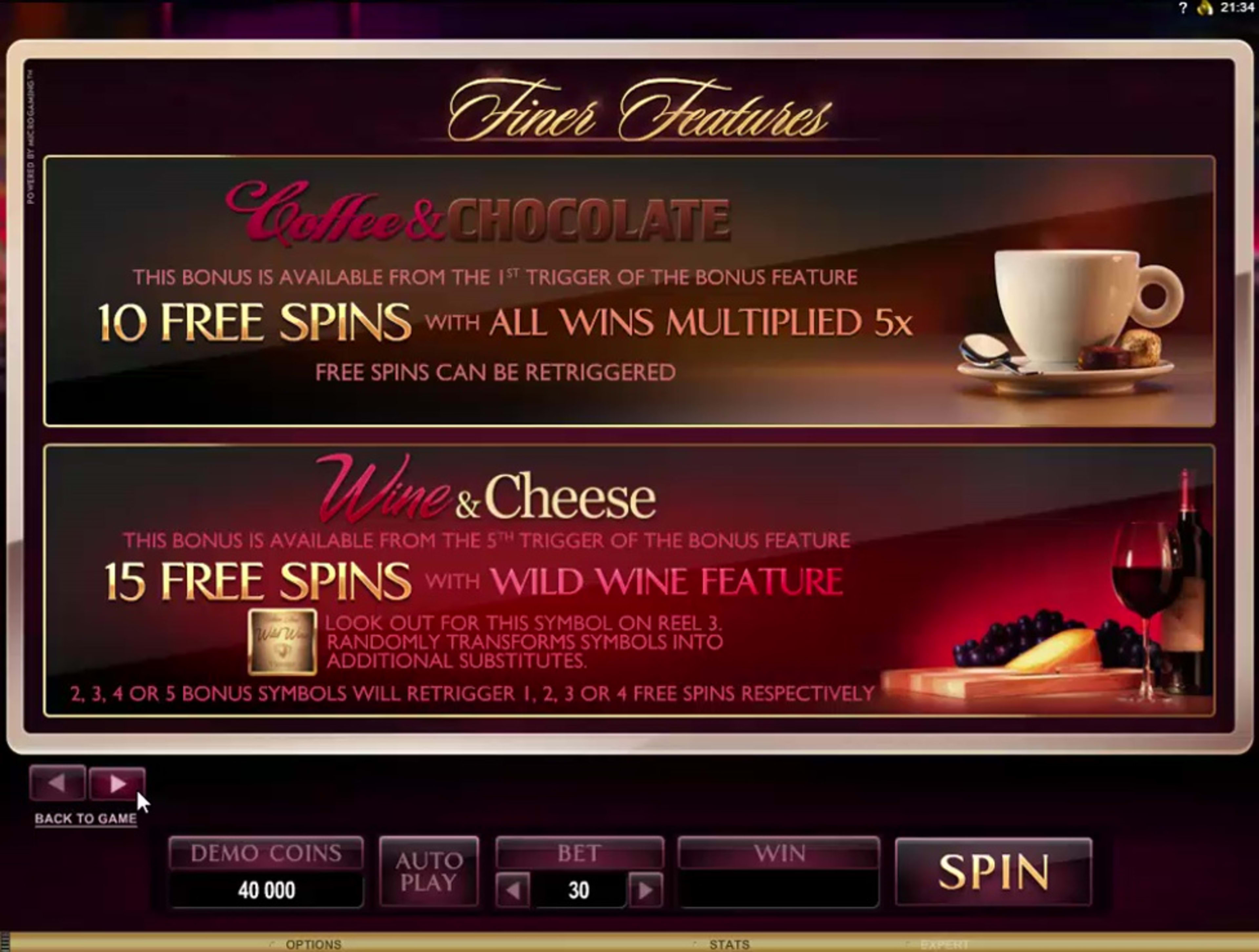 I found the list of features from this game to be pretty good. The action takes place on ways to win, not lines, so forming combinations and taking advantage of wild symbols is easier than in other titles. Speaking of that wild symbol, it’s the one that gives you the logo of the slot. It’s a symbol that can pay very well, up to 1,500x (7,500 coins), when forming combinations with other wilds. It’s also a substitute in many other cases, when it appears next to a regular symbol. The wild symbol can be used as a substitute, yes, but even better, it doubles wins that you form with its help. It’s not a replacement for the scatter unfortunately. Wild Celebration is another feature that you can get, a random one that can start up at any moment, transforming up to five reels into wilds. It has huge potential, particularly if you get all those reels transformed. It could end up getting you up to 243 combinations of 5 wilds, each one paying up to $1,500. Finally, we have the main feature to talk about, the one called Finer Features. It is triggered through the presence of 3 to 5 scattered Bonus Stars, which will also pay up to 250x the wager at the same time. Each time you trigger Finer Features, you get closer to unlocking another type of free spins. The first time you trigger Finer Features, you will get the Coffee & Chocolate feature from it. It consists of 10 free spins, where the wins are all multiplied by 5x. Once you’ve triggered it at least five times, you will start being offered the next feature, called Wine & Cheese. This one has 15 free spins for you, complemented by the Wild Wine feature, which adds extra wilds to the reels. The third feature will be unlocked at the 10th trigger of Finer Features. It’s dedicated to Whisky and Cigars and it has 20 free spins, where the Burning Wilds can turn symbols at random into multipliers of 3x or 2x, with a total of 6x possible this way. The fourth and final step is the one called Champagne & Diamonds, which you can trigger once you had Finer Features at least fifteen times. It has 25 free games for you, along with Rolling Reels where the consecutive wins get multipliers of up to 5x.