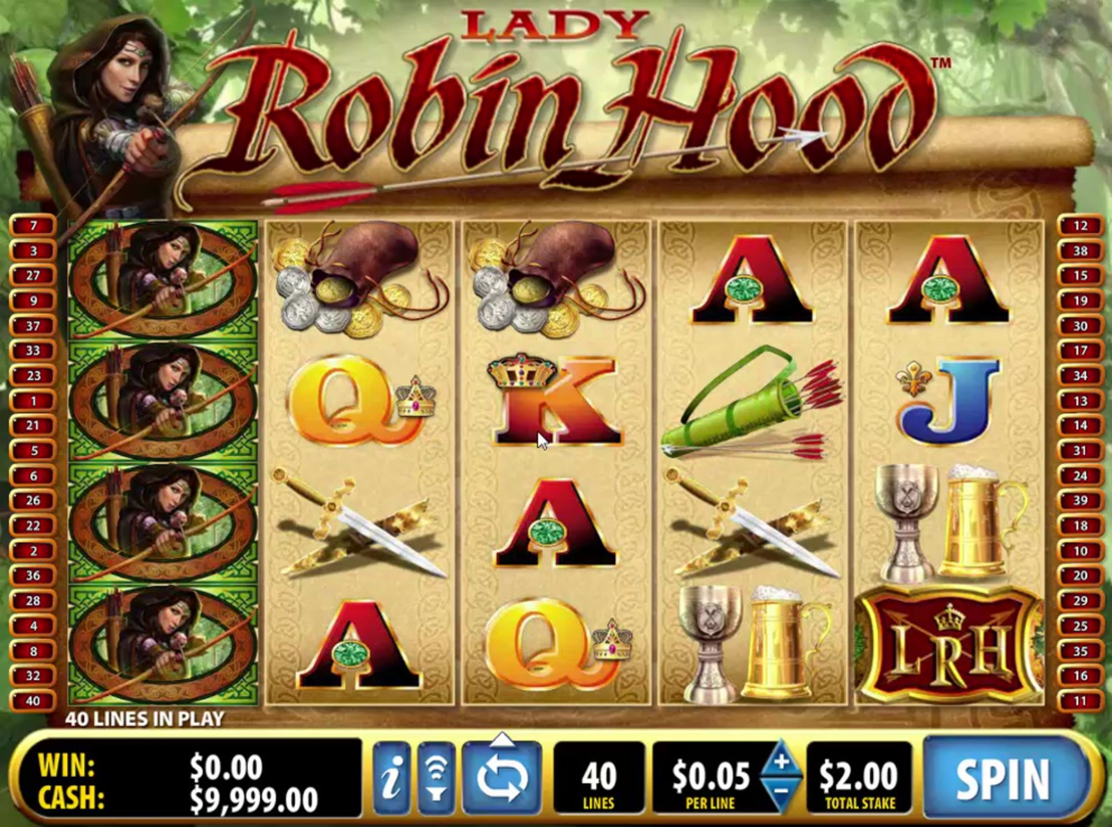 The bets that you can use in Lady Robin Hood are allowed to cover a fairly large range, starting from a minimum of just $0.40. The minimum line bet can be set to $0.01, while the maximum one can get to values that will allow wagers to be worth hundreds of dollars. Only the line bet can be modified, the number of lines stays the same, at 40.