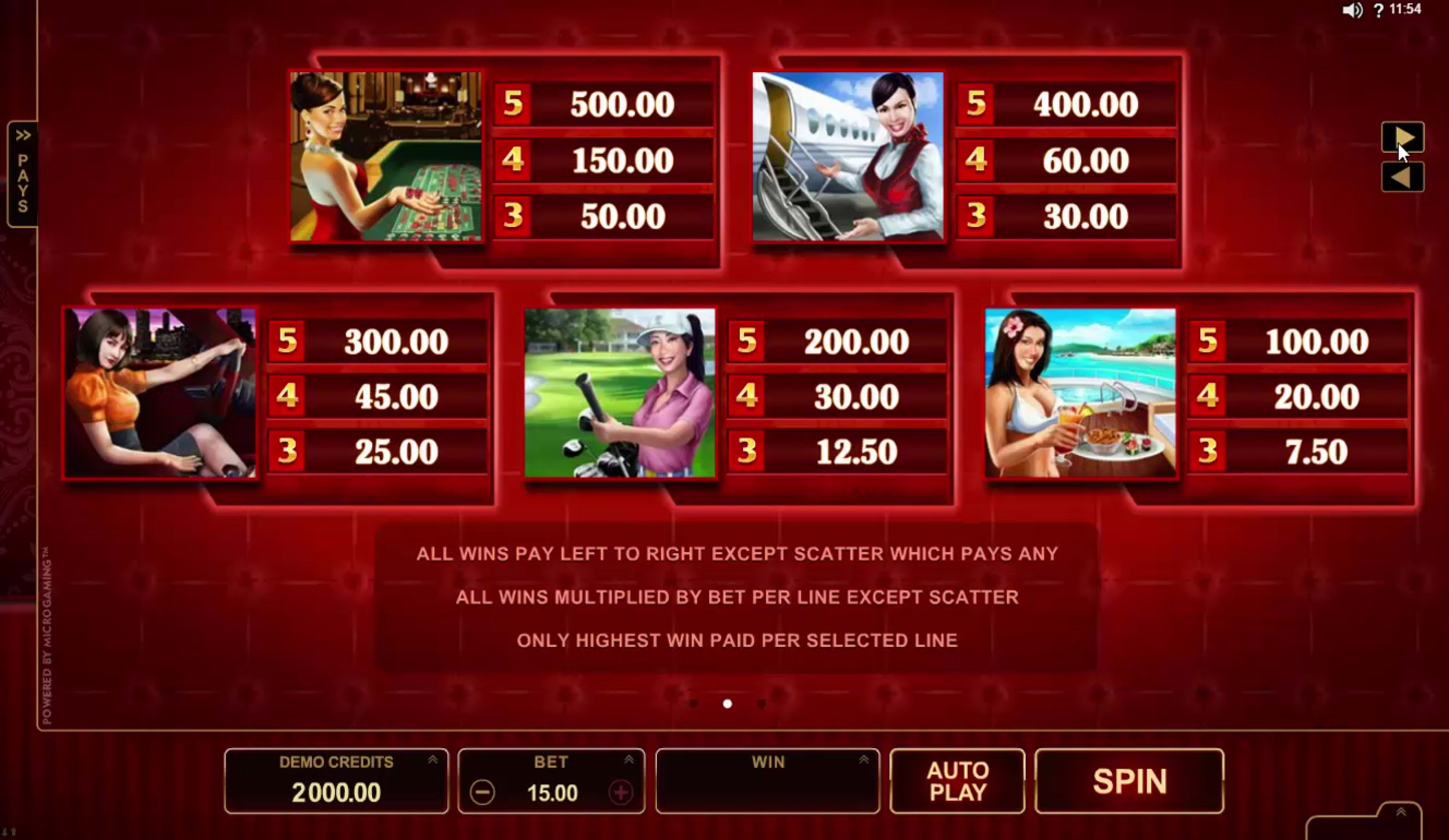 The regular symbol that can pay the most, up to $2,500 for a full combo, is the one that has the image of an elegant woman in a red dress, next to a roulette table. This is the only symbol, out of the regular ones, which appears stacked on the reels. The next symbol worth of a mention would be the wild, as a symbol which can act as a replacement for others, but which also pays on its own if it gets the chance. Its own combinations will pay up to $10,000. When it is used as a substitute, the wild will double the win offered with its assistance. You can form a combination of wilds with as little as two symbols, as long as they’re arranged properly.