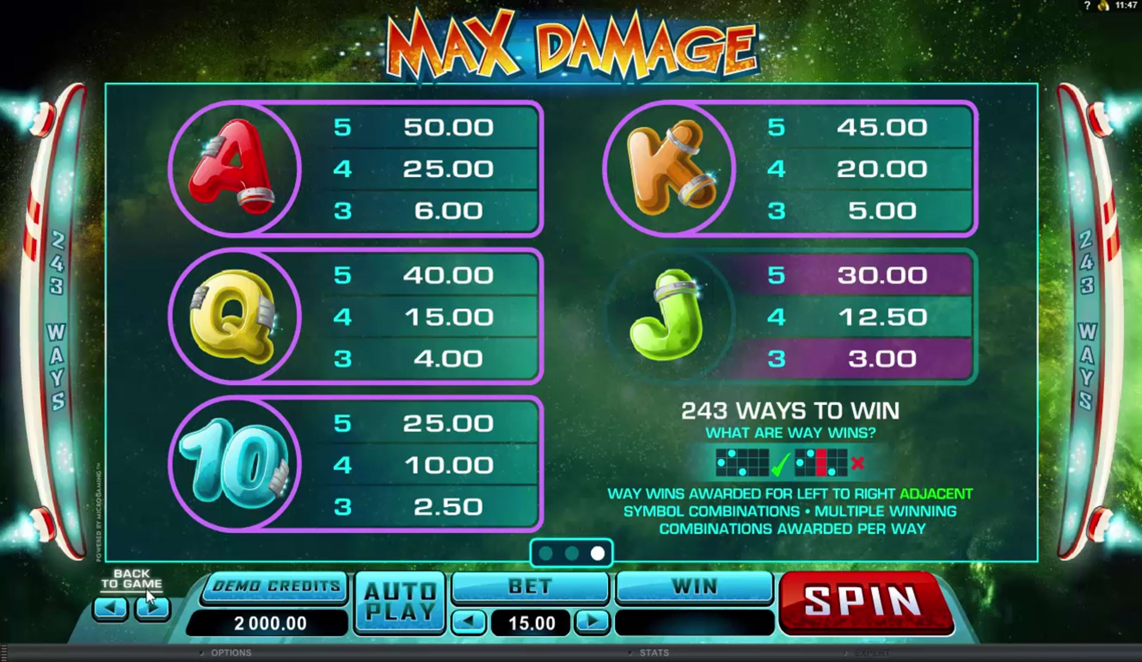 Covering a total of 243 ways to win with your bet is easy in most slots, since they don’t actually need 243 coins from you. They prefer to use a system with fixed lines, 30 in this case, and you pick just the line bet. For Max Damage, the wager per line is between $0.01 and $2.50, and the total range of the bets is from $0.30 to $75. The line bet has as many as 10 coins in it, with values of up to $0.25.