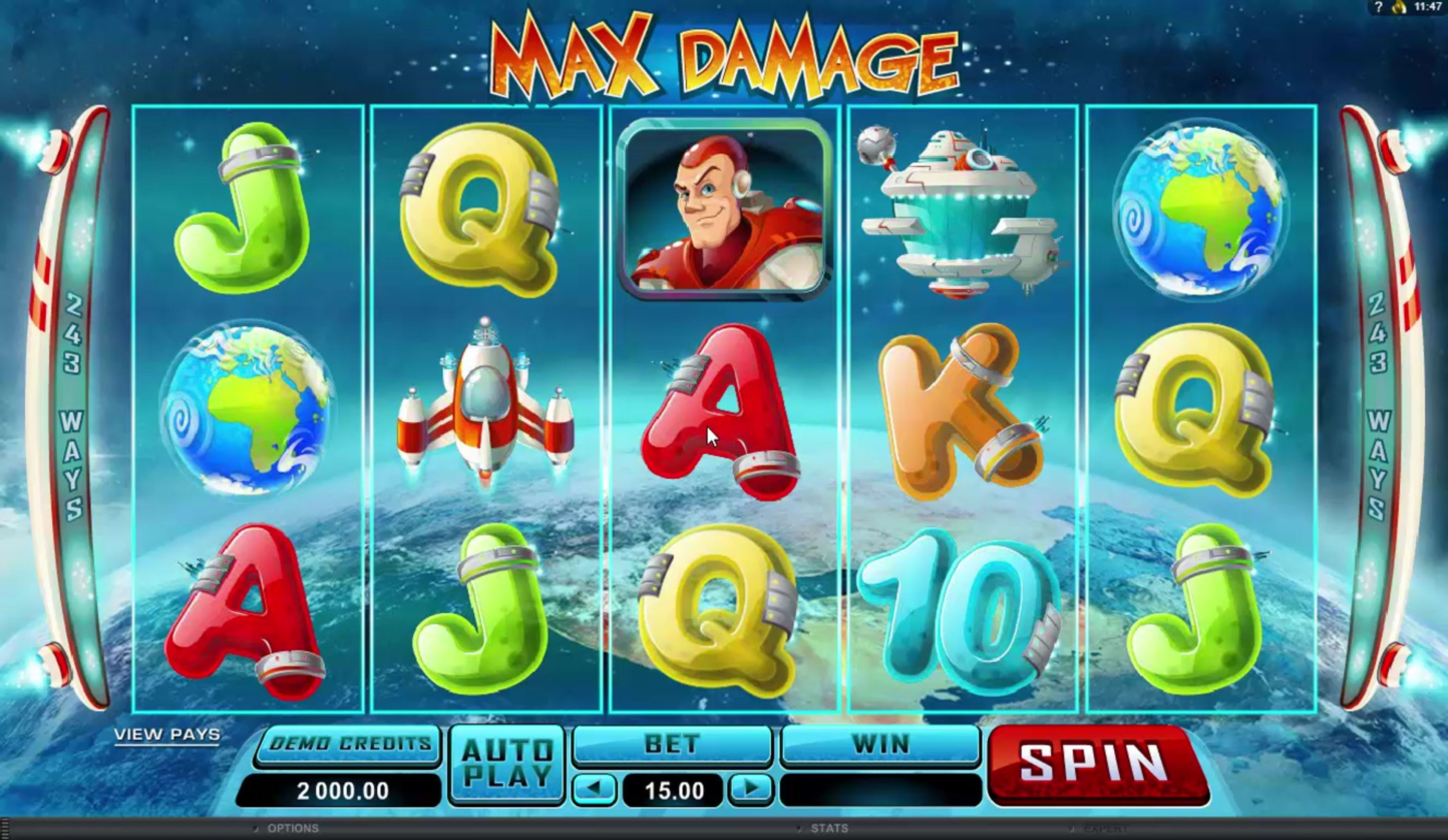 Max Damage is a game that’s placing the action in orbit around Earth, while on the reels uses futuristic space stations, UFOs and heroes. There is a cartoon like design inside, which makes it less sci-fi like than other slot machines which have taken on the same theme. It uses a setup which is not that unusual these days, revolving around 5x3 reels which get 243 ways to win in total from those 15 symbols. Microgaming relies on free spins, scatter symbols and stacked wilds for its major features. It advertises that it can pay up to $5,000 for a regular combination.
