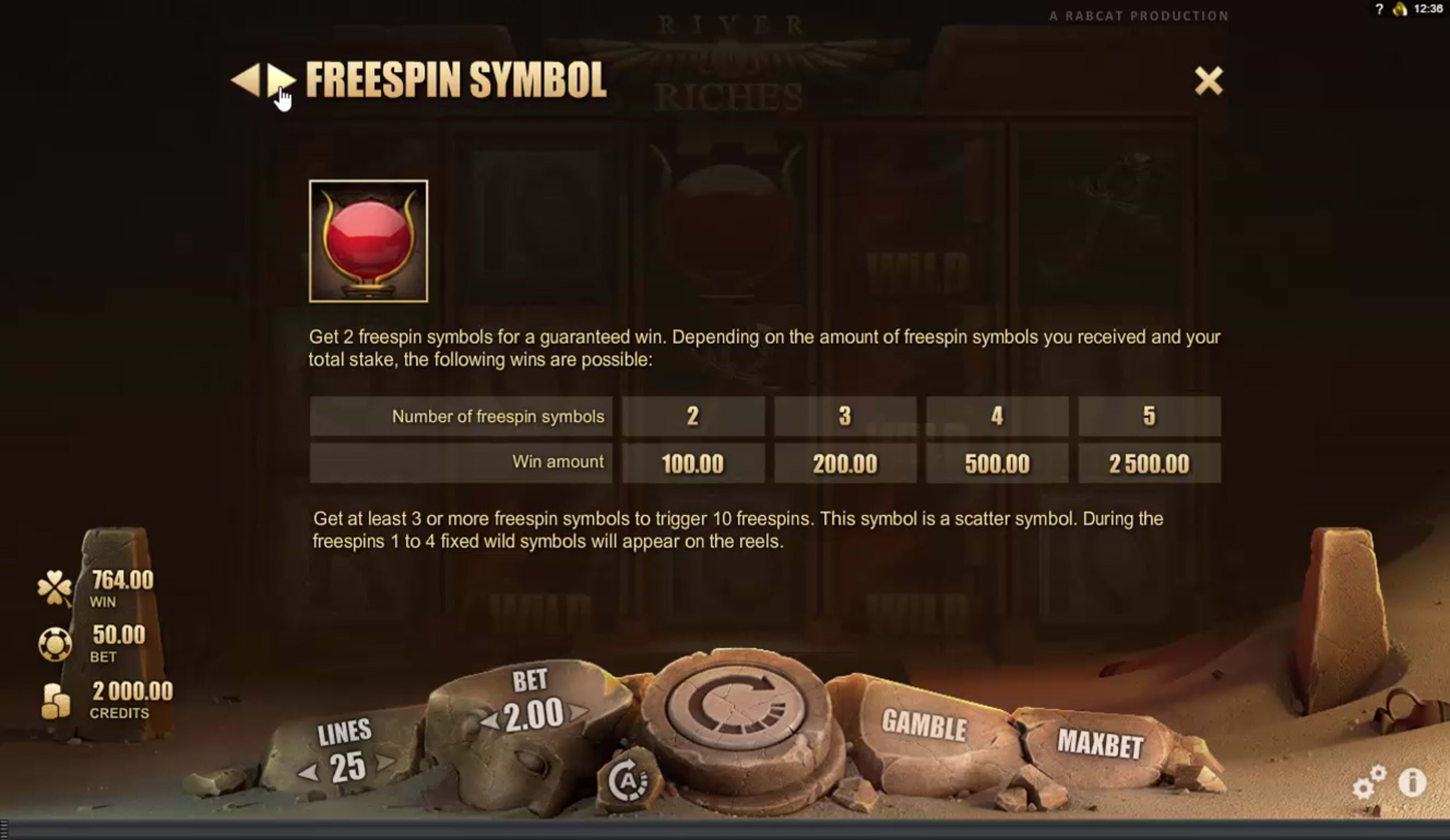 It’s a simpler betting system than in most games, but it still allows you to select things like the number of lines or the stake per line. Your stakes vary in value between $0.01 and $2, for each of the 25 lines that you can activate. The complete betting range in place in River of Riches starts from $0.01 and can go up to $50.