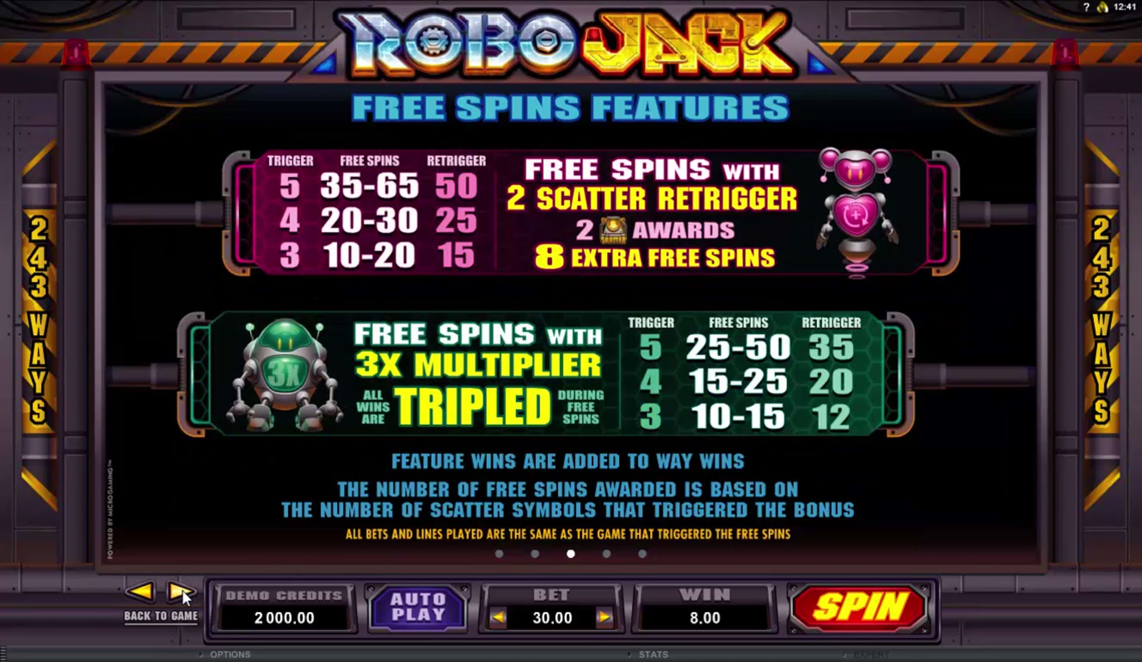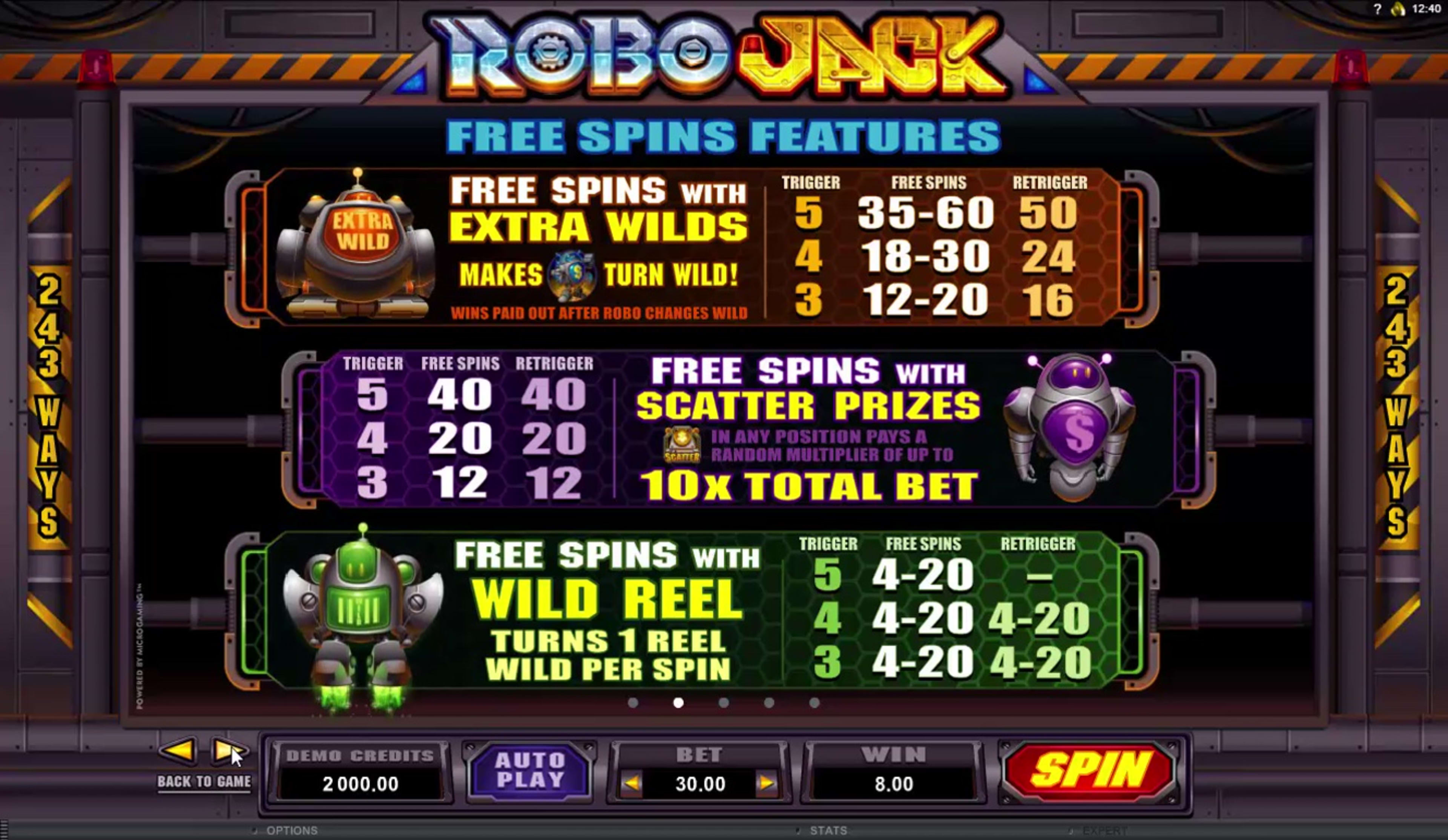 30 pay lines are included in the bet options that you can use in RoboJack. They’re considered sufficient when it comes to the coverage of the slot’s 243 ways to win. You may use up to 10 coins for each of those 30 fixed pay lines, but the minimum is just 1 coin per line. With the denomination ranging from $0.01 to $1, the complete range of your bets is going to be between $0.30 and $300.