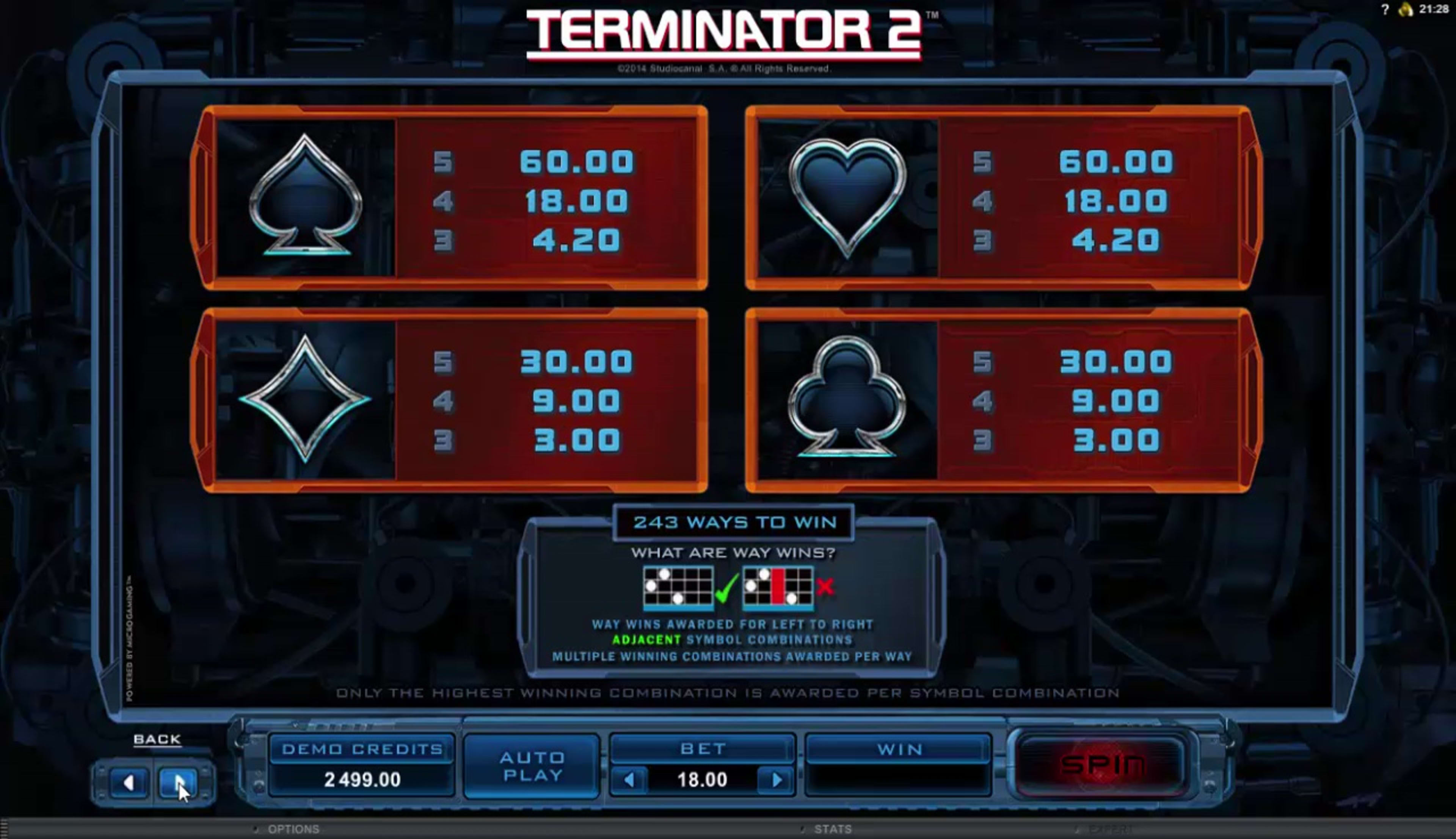 The basis for this slot machine comes from a film that was released in 1991, called Terminator 2: Judgement Day. It was obviously the second Terminator movie to be released, the first one coming out in 1984. The action revolved around killer robots that were sent from the future, to kill or protect (depending on the side they were on) a human from our times that will grow up to be a leader of the resistance in a fight against robots. It was a hugely popular film in its time. For the slot machine that was created based on Terminator 2, you will find that the developers received permission to use images of all the major actors from the film. Among the more important symbols you will find images of actors like Arnold Schwarzenegger, Robert Patrick or Linda Hamilton, but also those of the killer robot that was sent from the future. Once you get past the symbols with photos of actors in them, you end up with a couple of logos and with the four card suits. I wouldn’t call Terminator II some great masterpiece. The design follows in part the look of the film from the early 90s, and it just adds some non-related symbols to those with the photos. In the background they just used an image with machinery, though kept in the dark so you don’t understand much from it.