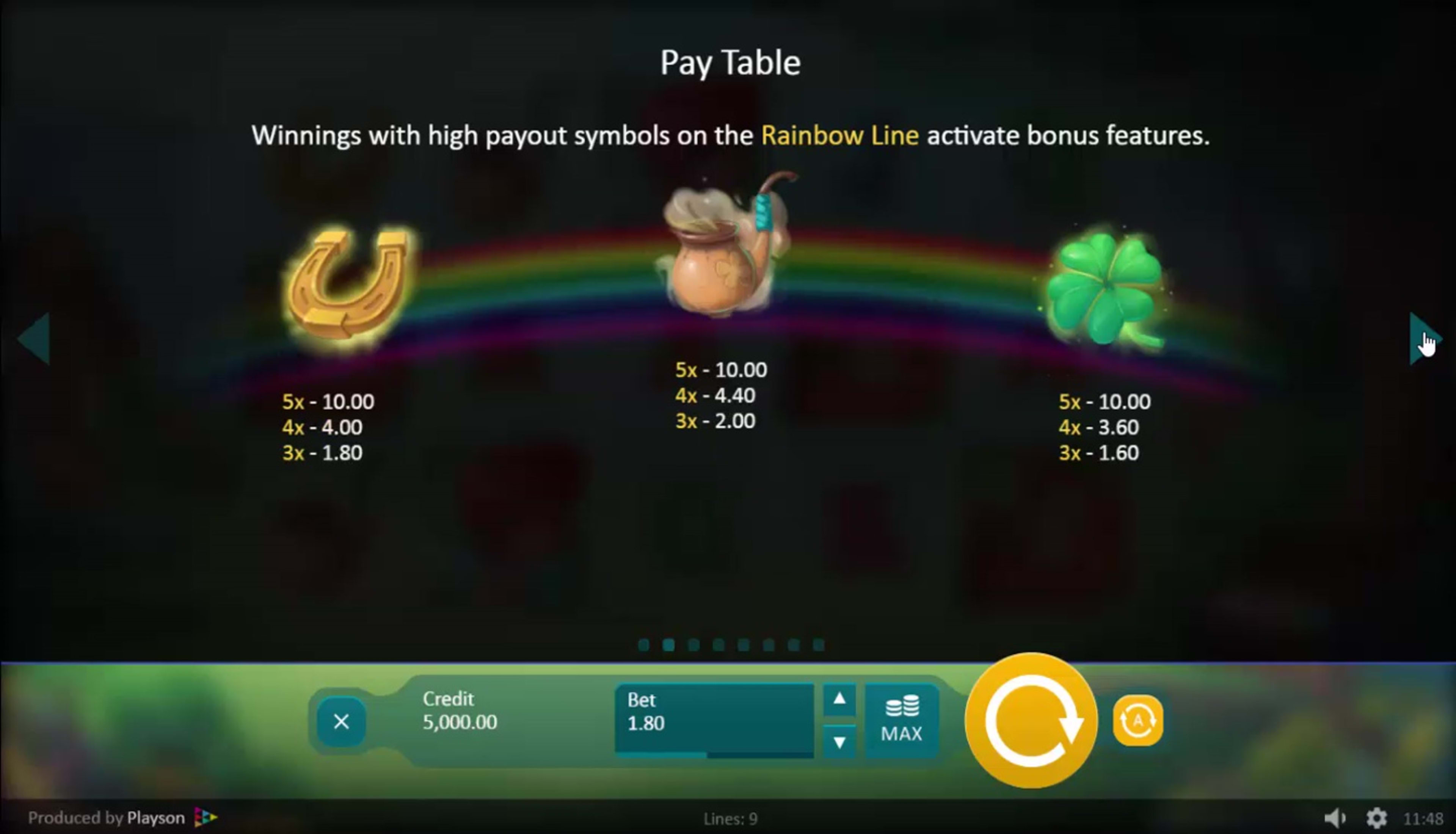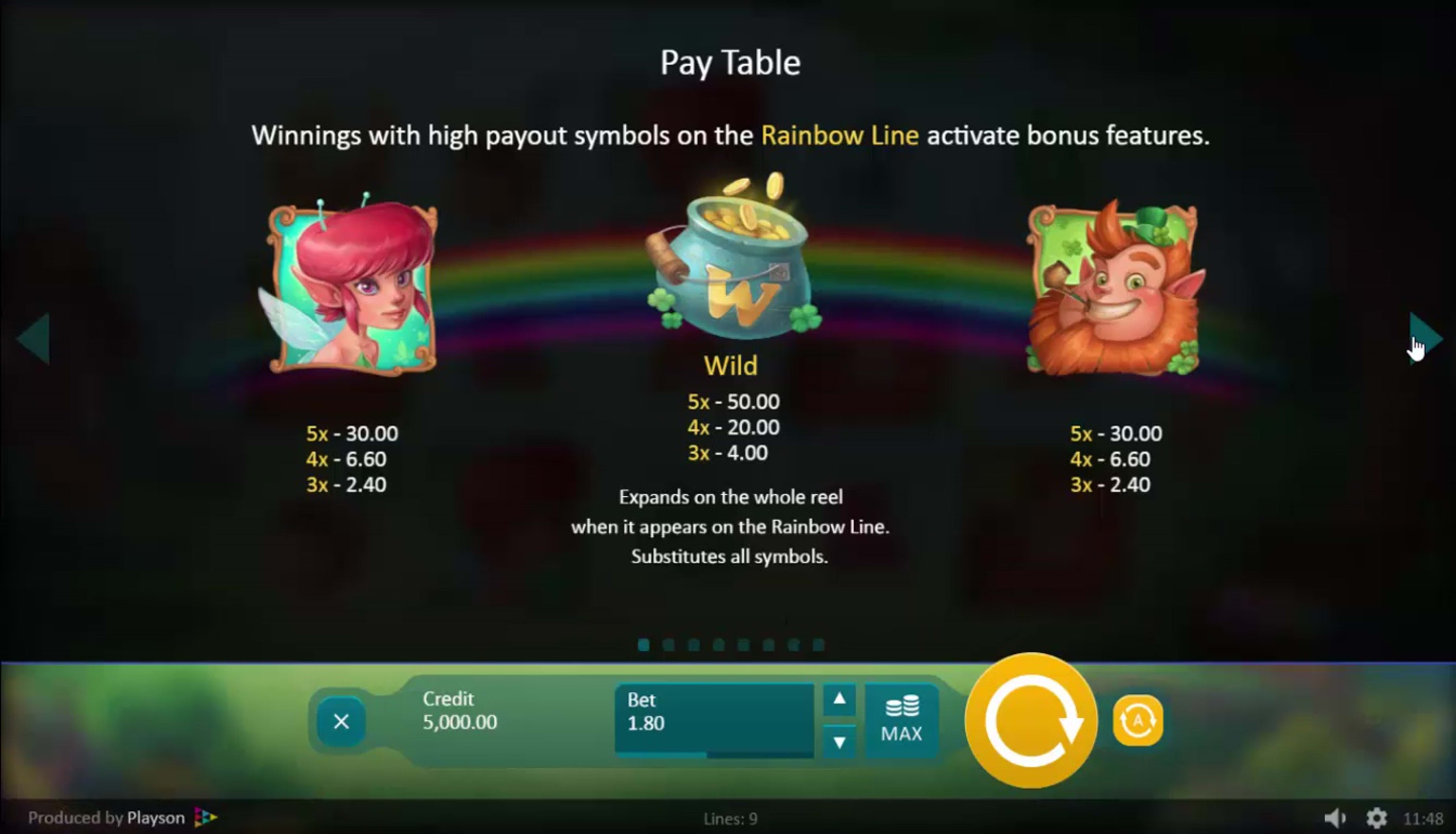 The Clover Tales top prize appears to go up to $2,500 only, but the game makes up for it with its various features that can be triggered through the Rainbow Line.
