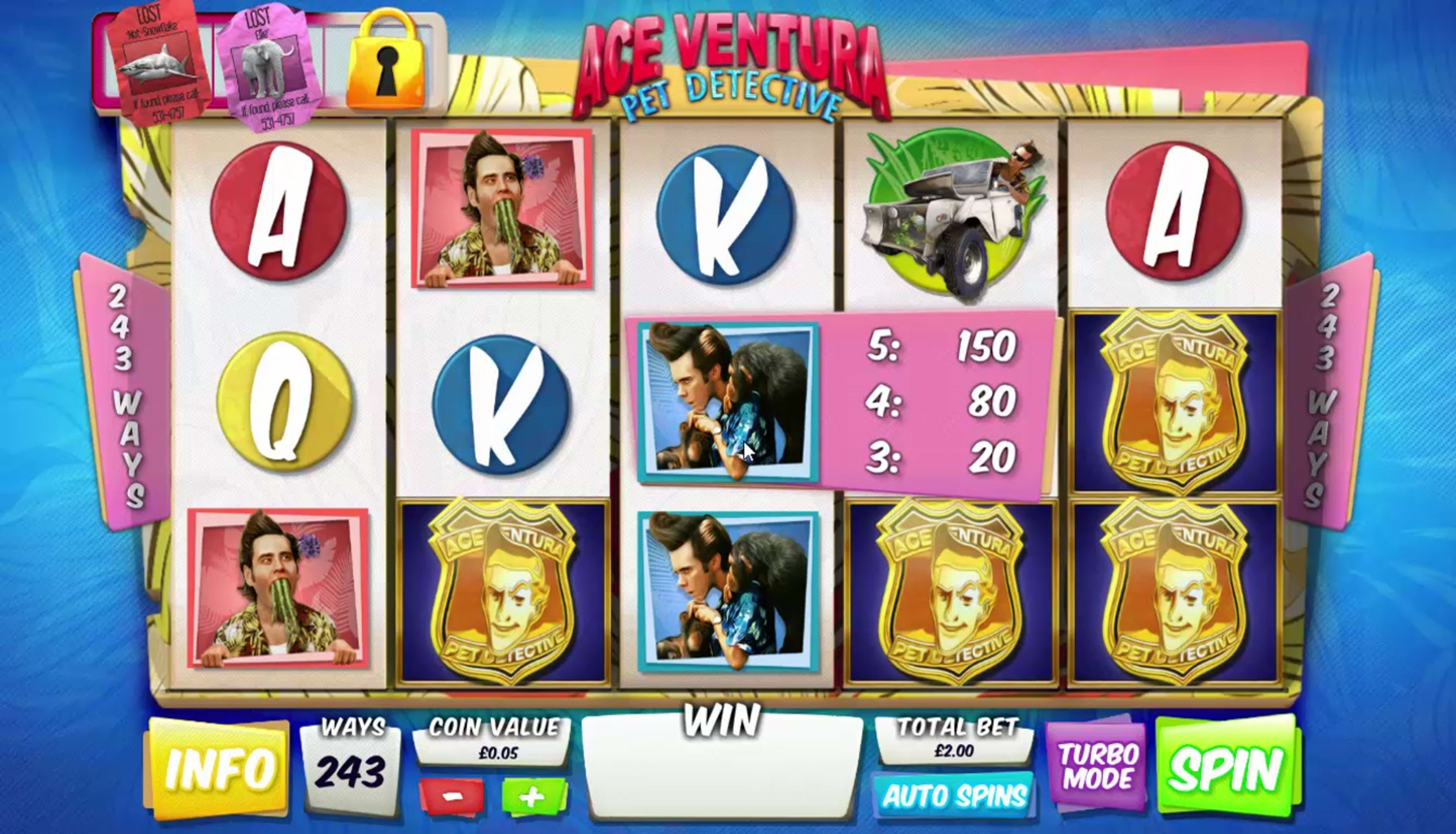 Ace Ventura: Pet Detective is a game that Playtech created based on the popular 1994 film that had the same name. They obtained the rights to create this branded slot machine, and they actually seem to specialize in such titles, based on movies, TV series or comic books. There are 5 reels in Ace Ventura, hosting a total of 243 ways to win, which are obviously always active. You apparently can get paid up to $500 through the regular combinations. The features which the game introduces along the way include a wild symbol, a scatter, as well as animal modifiers which are useful during free spins.