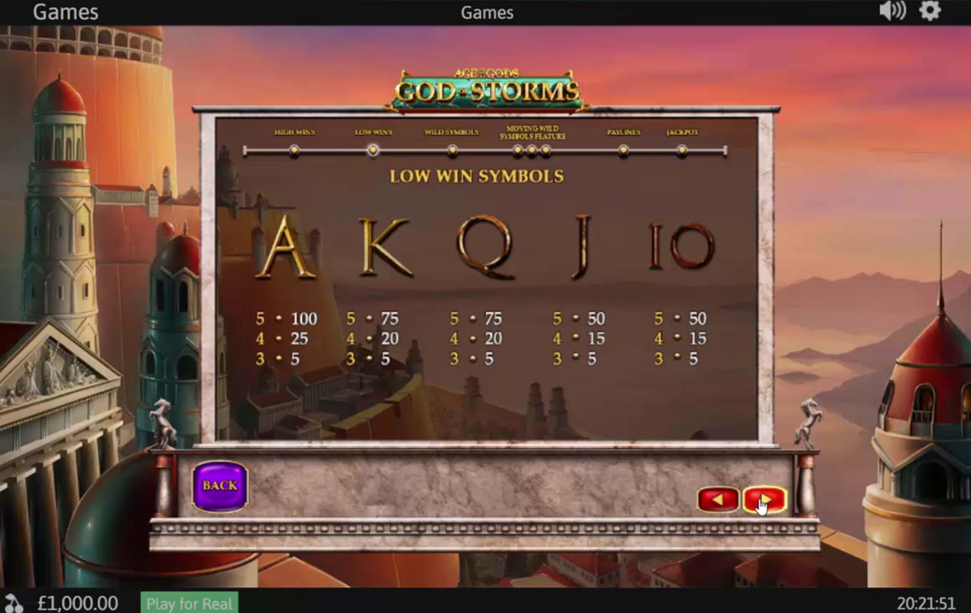 There are two sides to the bets that you select for the game, the lines and the line bets. The number of lines is normally at 25, but it can be reduced by players that want to do that. The line bet is starting out from the usual minimum value of $0.01 and it can be taken as high as $10. The maximum bet selectable for God of Storms will reach a value of $250.