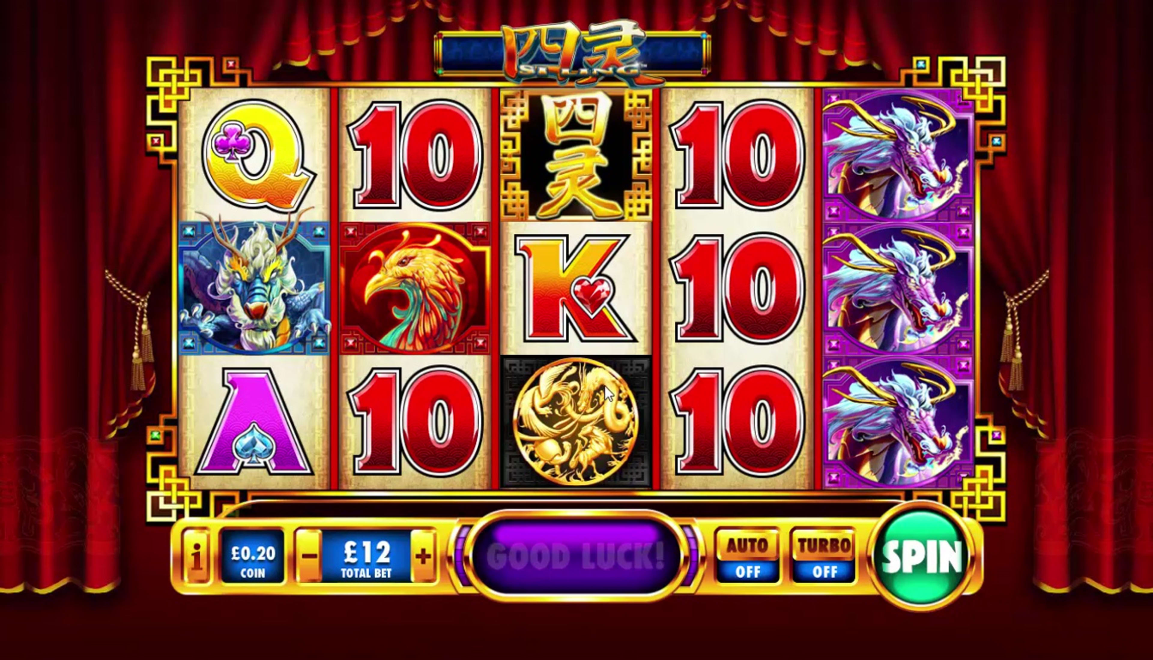 I’m not quite sure what Si Ling means, and I couldn’t find much about those words, but you can easily figure out that the theme in this game is inspired by China and by its legendary creatures. The dragon is already one creature that everyone heard about, but there are others that the Chinese stories mention, like a Phoenix bird and a huge turtle, and those are present in this game as well. There are actually two types of dragons that appear in the game, one colored in blue while the other is purple. The surrounding graphics are showing red curtains, making it look like the reels were placed on the stage of some theater. Symbols give us the two dragons, the turtle and the Phoenix bird, along with a Chinese writing logo, with a gold coin with the creatures on it, plus various card logos that you will get from a lot of slots. I’ve enjoyed the design of the high win symbols, but the surrounding graphics and the background image don’t add much. Don’t even get me started on the card symbols and their look, which is completely unrelated to the theme.