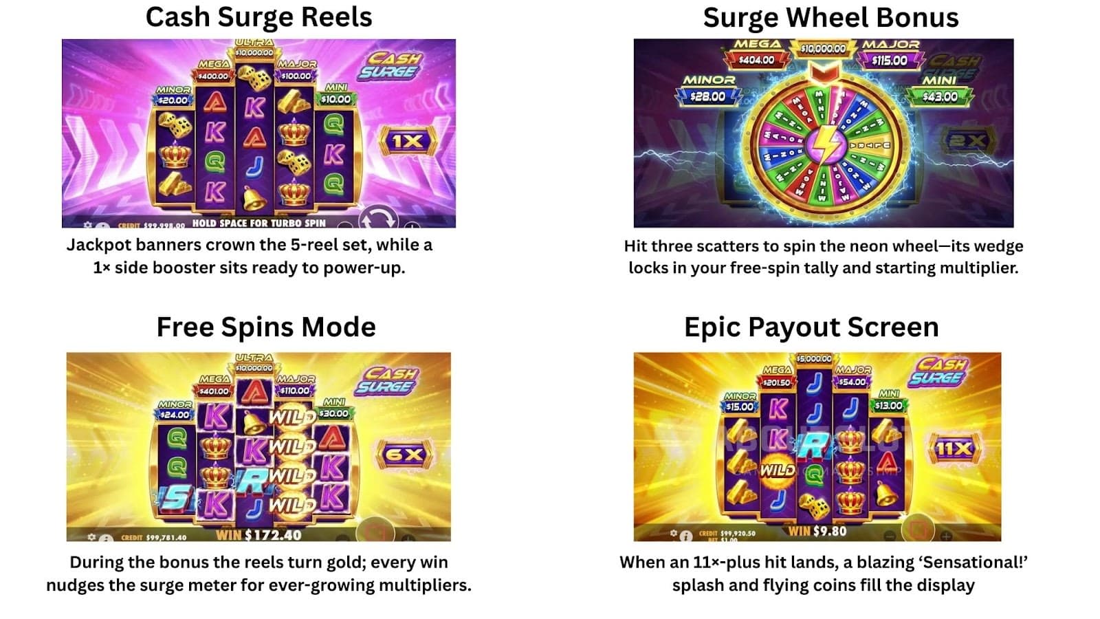 Scatter letters stick until you spell SURGE, launching four Free Spins. New letters add spins, and lightning can still bump or award a progressive—making a 5 000 × Ultra prize possible in a single zap. With no Feature Buy, patience and bankroll management are key; many players build progressives in the base game before the burst.