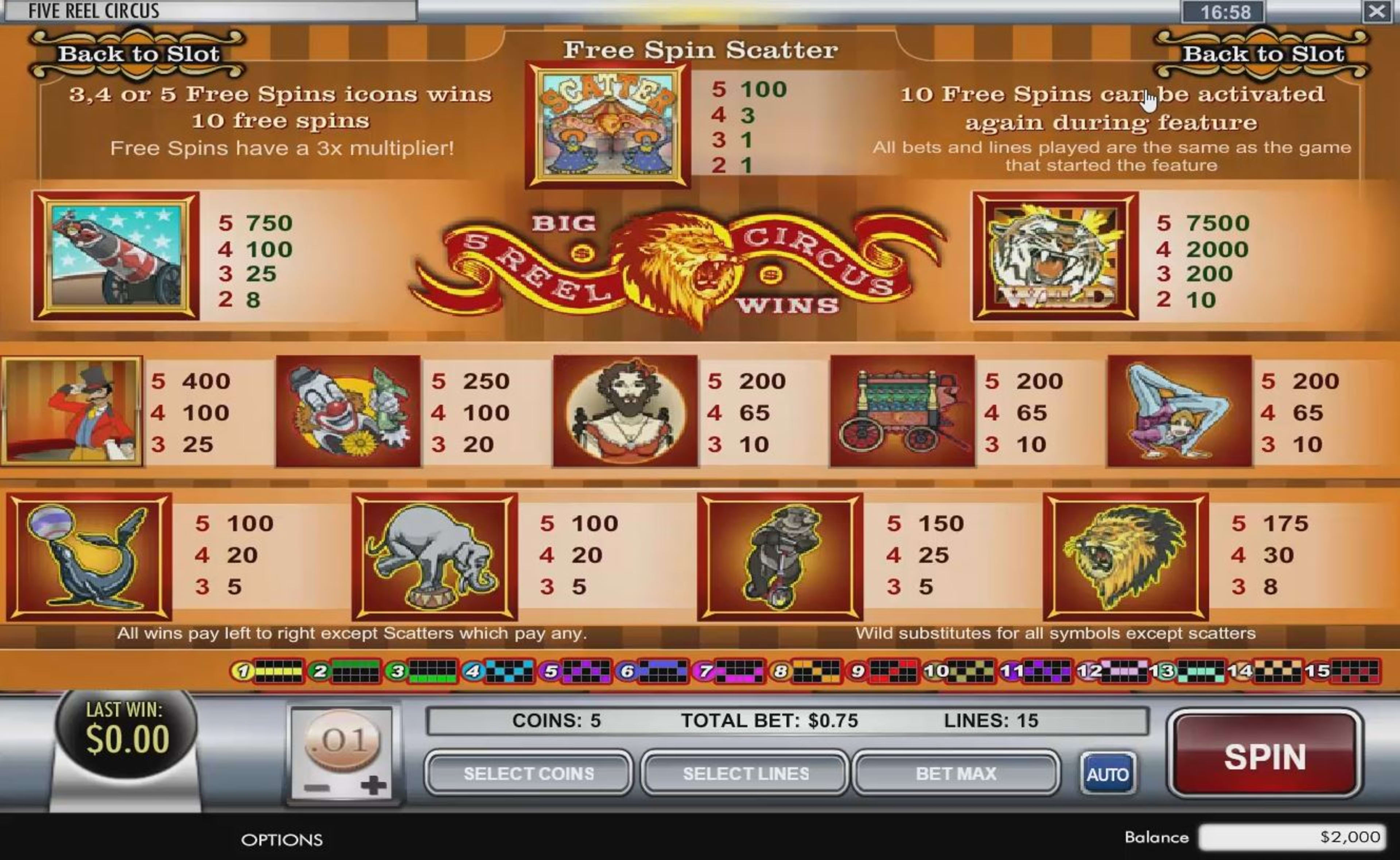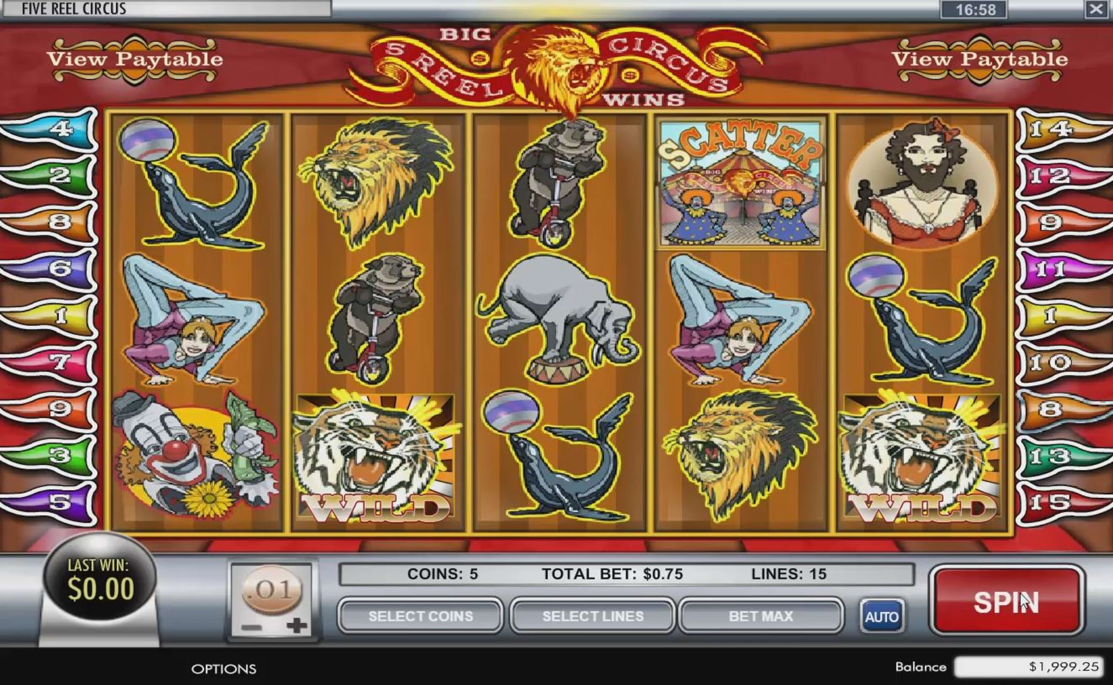 5 Reel Circus is a simple circus themed slot machine, the sort of game that has dated graphics, looking like it was created in the early days of the online slot industry. The theme is all about the circus though, so don’t expect to find anything annoying here, like poker cards. The circus theme has obviously been done a lot better by other developers, even in recent years, and so it’s up to the features to prove that the game is worthy of being played. You’re going to be able to play with at most 15 active lines, with a setup of 5x3 reels and with the promise of a top jackpot of $112,500. The slot manages to include quite a few fun features, including free spins with multipliers, scatter symbols and a wild.